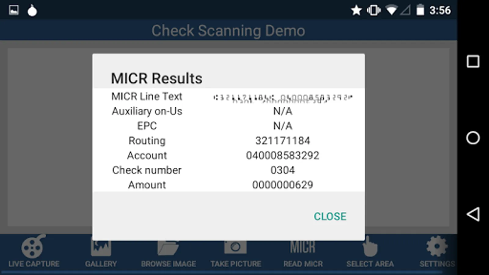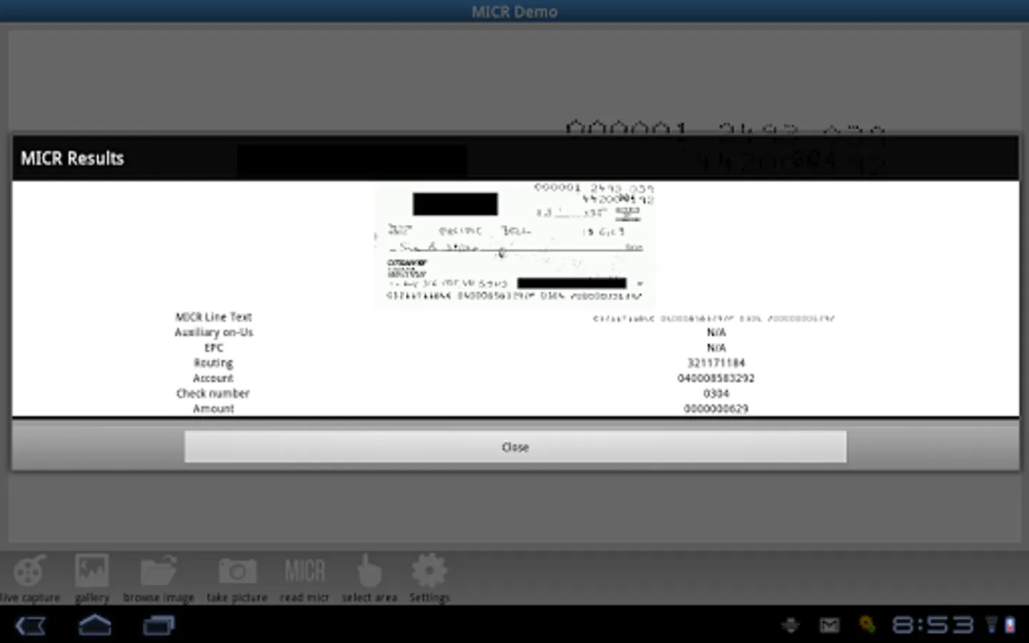 • Show the part of the original image that contains the MICR code area and the extracted MICR code fields such as: Transit, Amount, On-Us, Account number, EPC and Routing