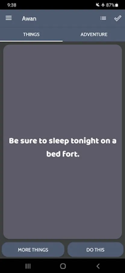 Awan is a an application that gives you idea and challenges to do when you are bored. To simplify , Awan is a boredom killer application.