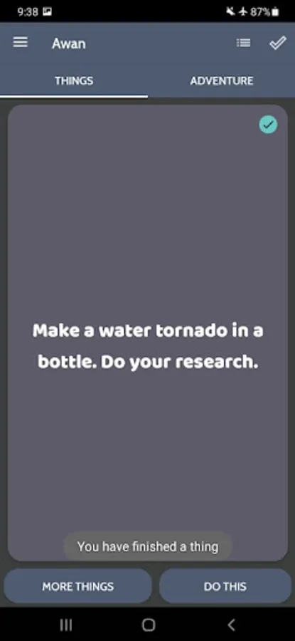 For the mean time , Awan has two sections of what you can do. First are the random things. This section suggest the things you can do to kill your boredom. Second is the adventure mode. Adventure mode lets you explore your surroundings. You will be surprised on what you may discover if you use this section.