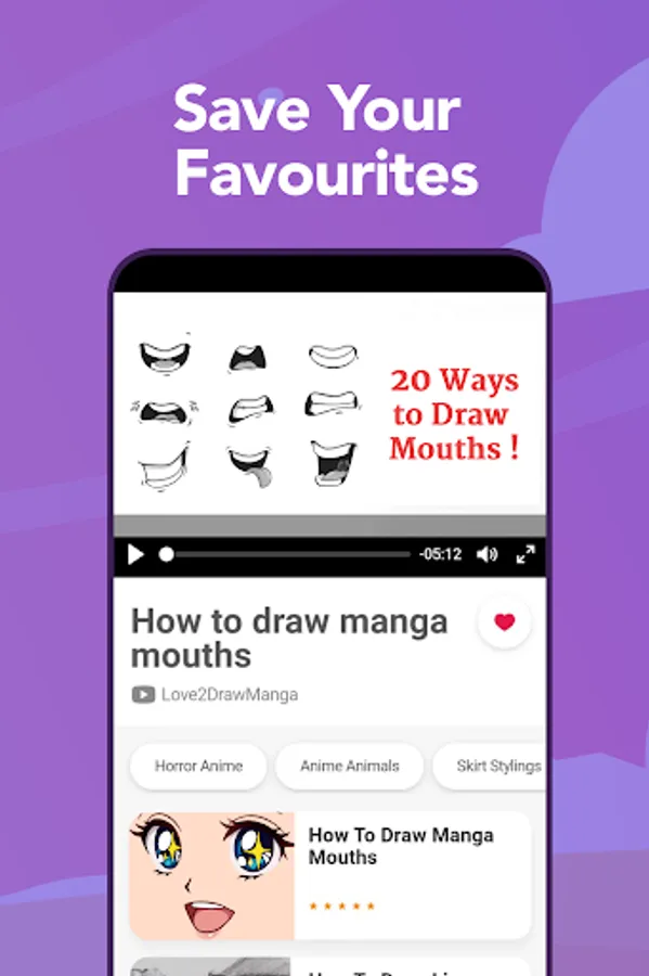 You can add any number of draw anime tutorial videos to your favorite section of the app and watch them whenever you want. Our manga coloring lessons and beginners categories are worth watching more times. You can also share the anime drawing lessons of your favorite characters with your friends and have fun. Search for videos with any anime character or series name and reach out to your favorite video without wasting time.