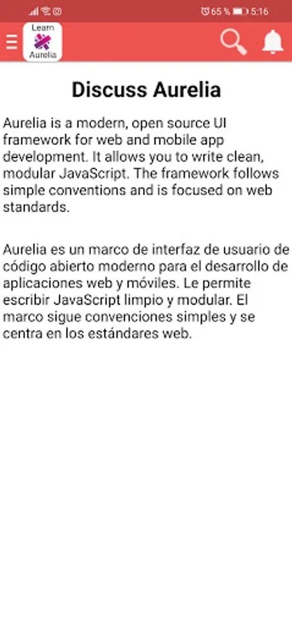 Aurelia es un marco de interfaz de usuario de código abierto moderno para el desarrollo de aplicaciones web y móviles. Le permite escribir JavaScript limpio y modular. El marco sigue convenciones simples y se centra en los estándares web.