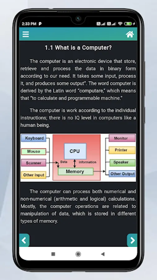 Computer Fundamental and computer guide is useful for those who are going through computer skills development courses like computer basics, hardware, software, CPU and their components, etc. This TUTORIAL explains the foundational concepts of computer hardware, software, operating systems, peripherals, etc. along with how to get the most value and impact of computer technology. The main aim of this application "Computer Fundamental Tutorial" is how to use computers and their components.