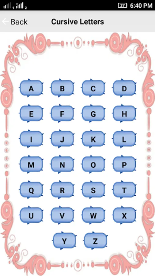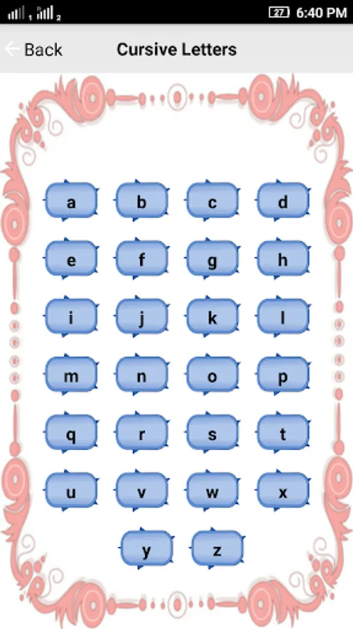 The app will give you the opportunity to learn upper cases and lower cases. You will have the opportunity to watch a demo of the letter being created. You can go back to the previous letter or forward to the next letter. You will have the opportunity to watch the letter being created over and over again by hitting reload. This will help you learn how to make the letters on your own after watching the app.