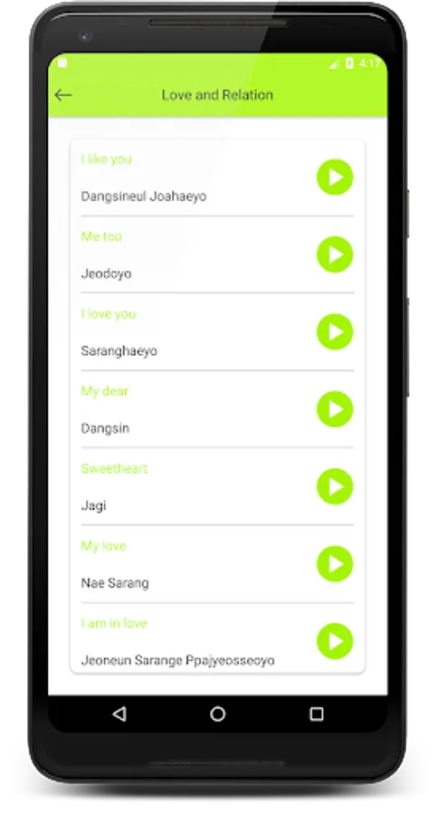 If you are wanting to learn a specific category of words, Learn Korean | speak Korean will best choice. It provides Korean translation for most frequently used words and phrases for more than 30 categories. You can use it like an English Korean dictionary for Korean words and Korean phrases.