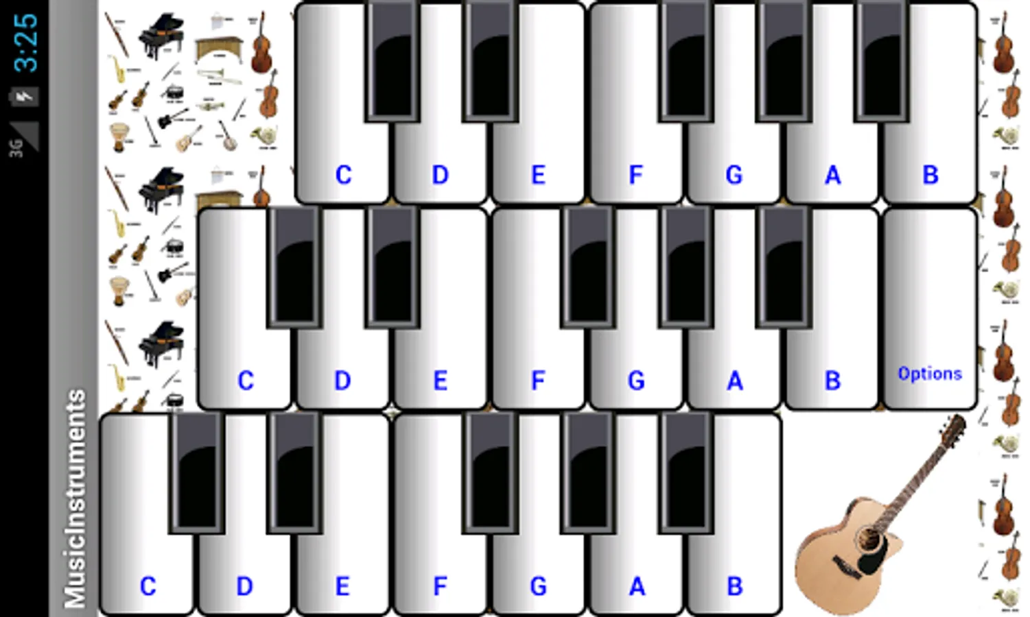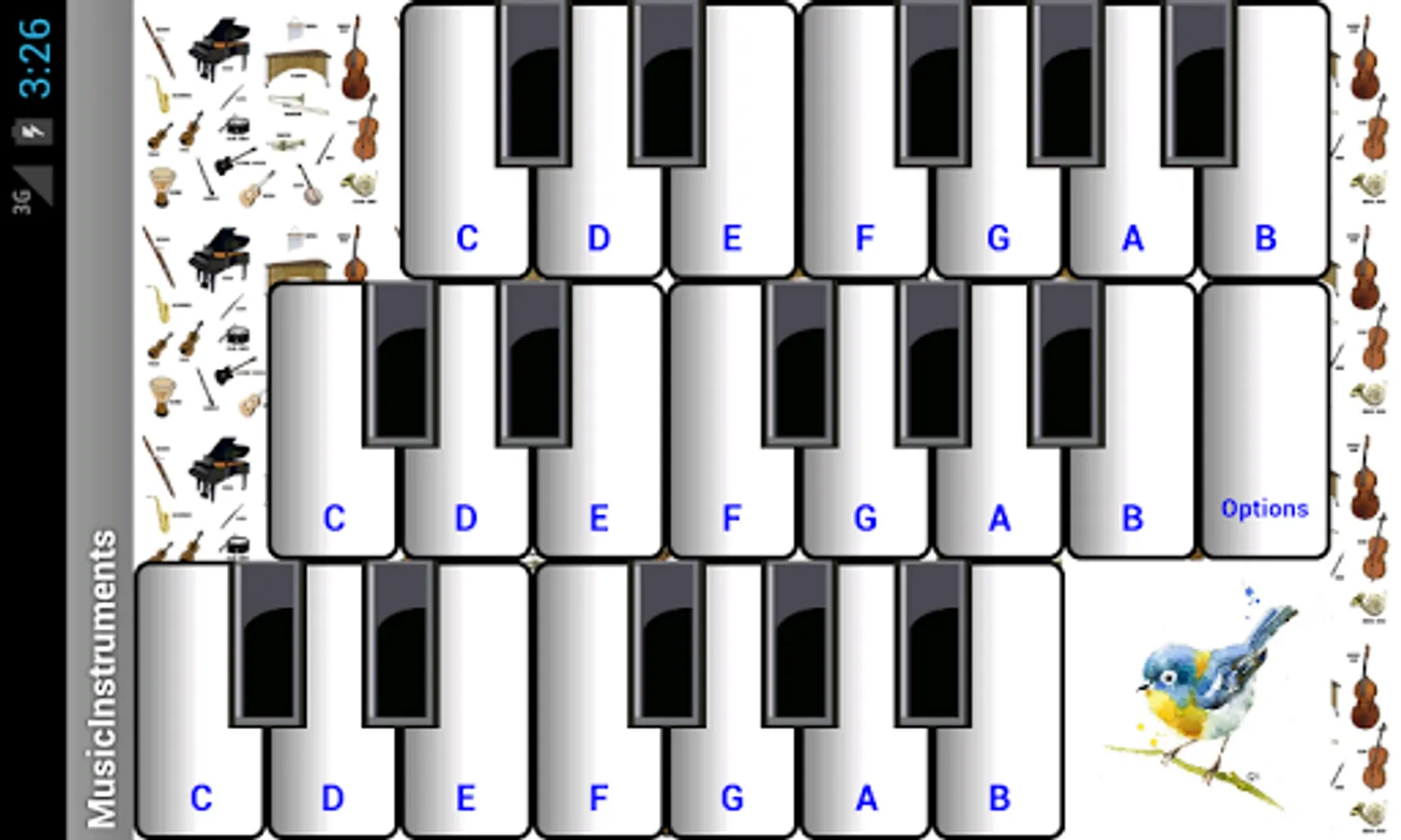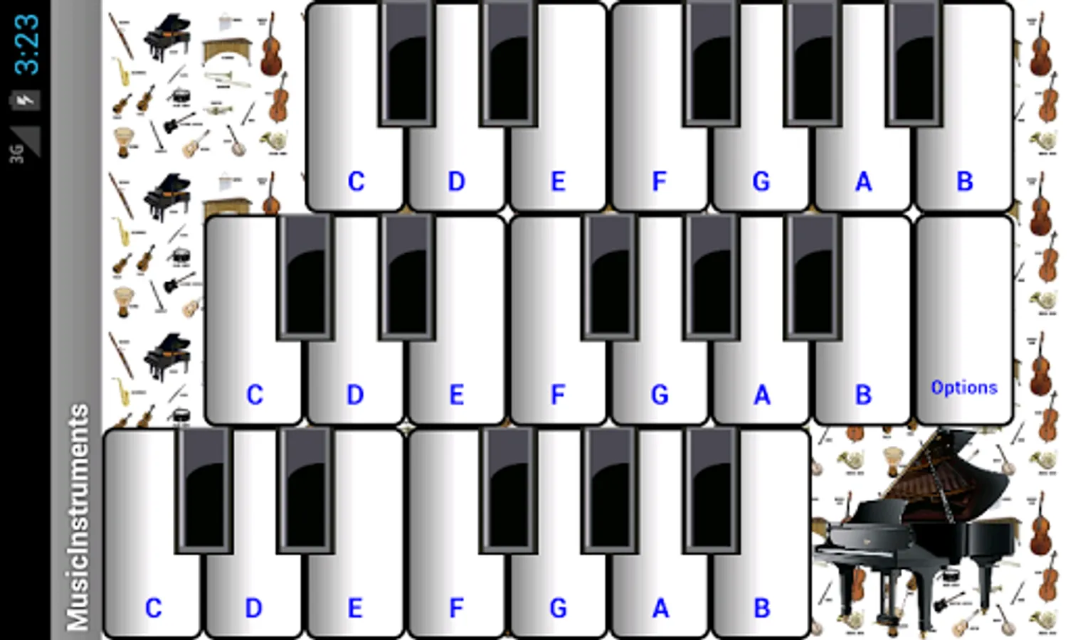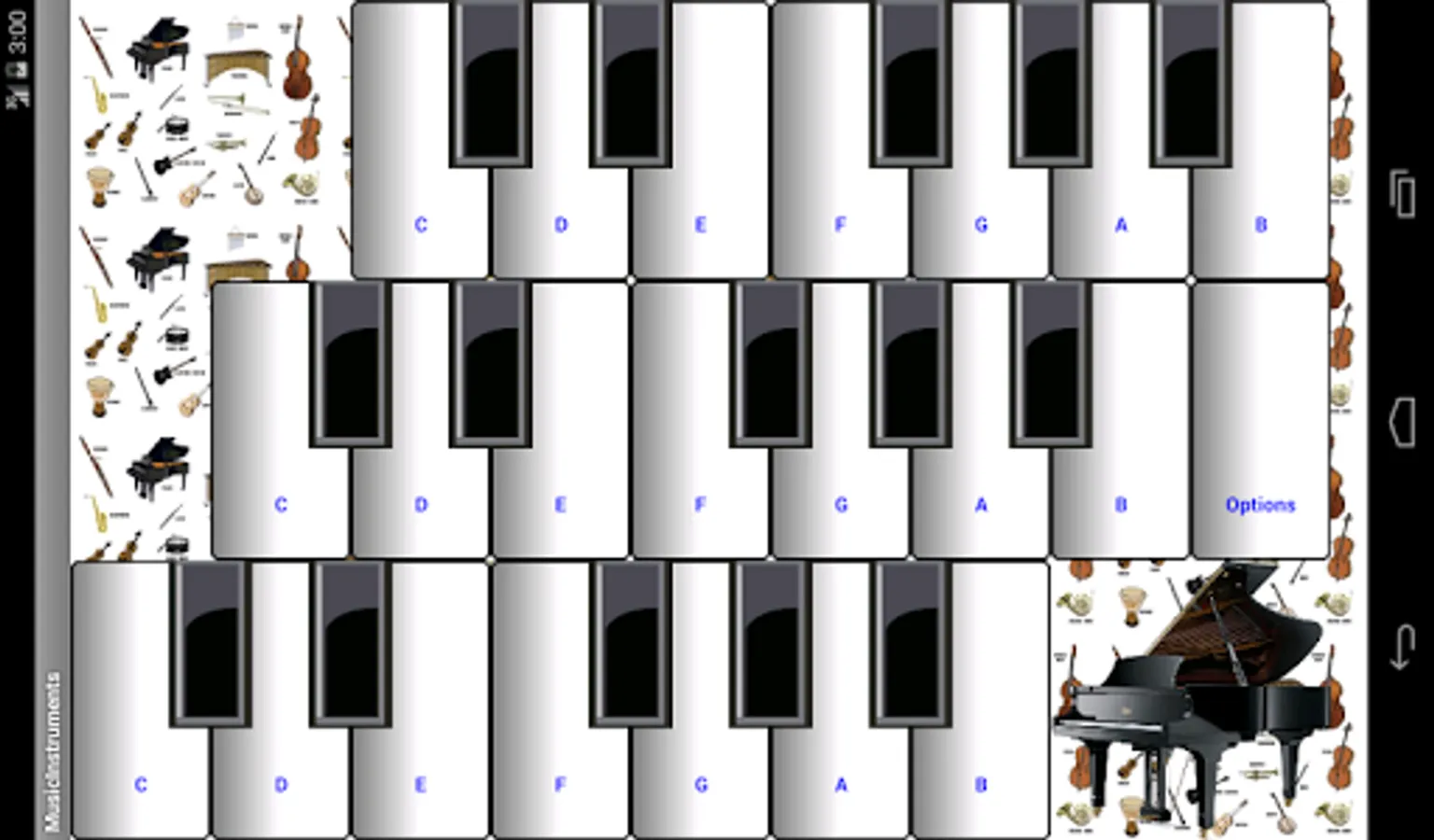 Have fun playing all kinds of sounds. Entertain your family and friends with this very easy to use simulated musical keyboard. Play any melody you like in different instruments. Look, listen and play the melodies from various cultures and countries around the world. Music keyboard spans 3 octaves. Multi touch with more that 3 fingers depending on your device. Note transposition possible up or down half a tone allows you to accompany real physical instruments. Works with telephones and tablets.