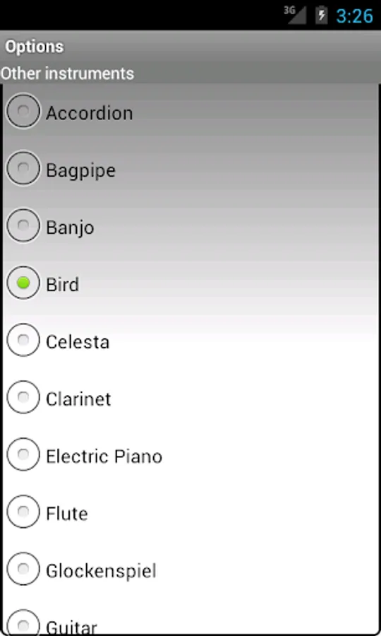 76 musical instruments or sounds available in 5 categories including Wind, Strings and Percussion.