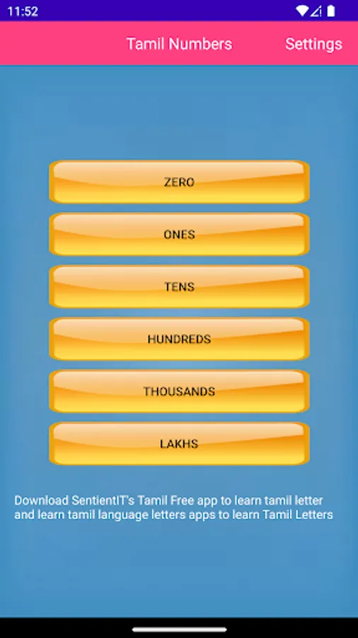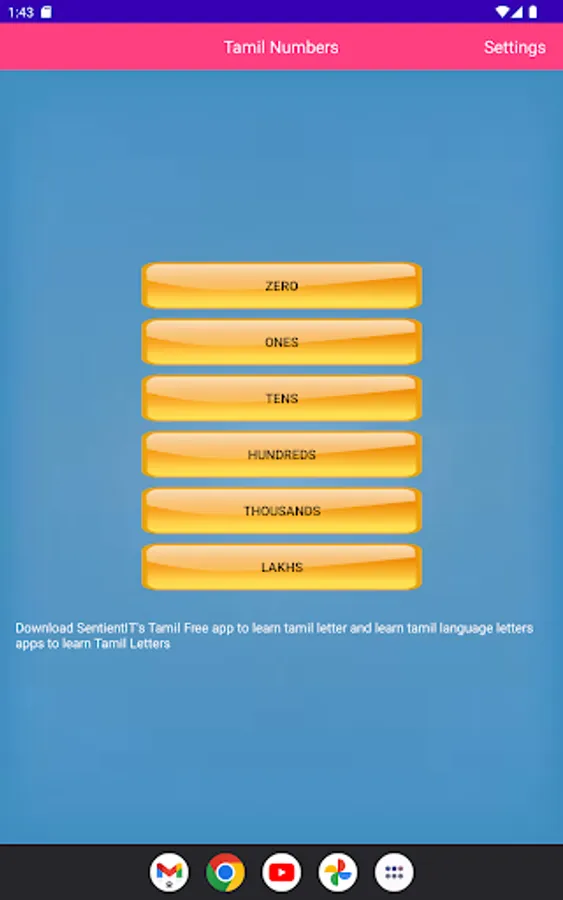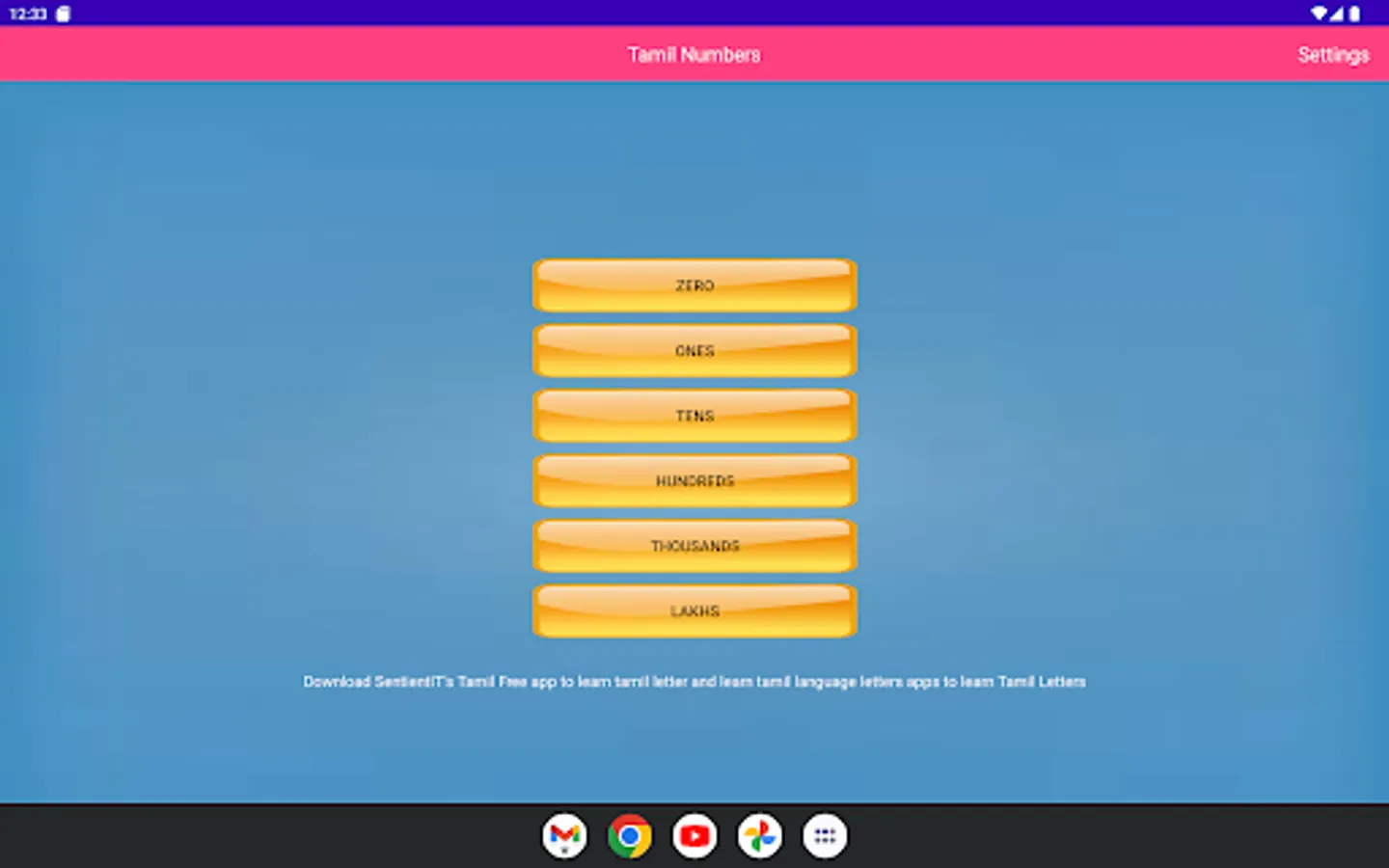 There is an imbedded voice behind every single number; a child has a chance to learn Tamil language letters without getting help from a Tamil teacher or going to learn Tamil online. The voice is clear enough to enable the child to pick up what is being intimated.