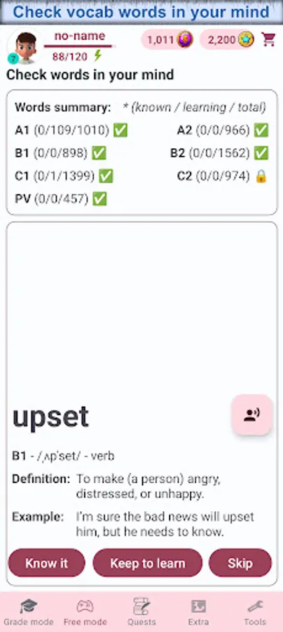 * Discover English vocabulary words with meaning from destination a1, a2, b1, b2, c1, c2 and phrasal verbs base on their phonetic, definition, pronunciation... Choose words to learn, adjust meaning & example accordingly.