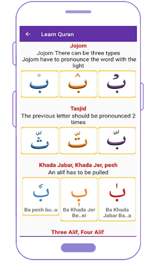 - You can learn how to Pronunciation here Jojom , Tasjid , Khada Zabar, Three Alif, Four Alif Word.