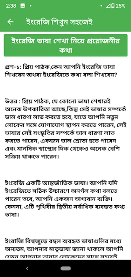 কারণ আমরা আমাদের এই অ্যাপটিতে ইংরেজি শেখার প্রত্যেকটি লেসন,টেকনিক এবং নিয়মগুলো খুব সহজভাবে (প্রয়োজনীয় বাংলা উচ্চারণসহ) উপস্থাপন করেছি,যাতে করে আমাদের প্রিয় পাঠকগণ খুব সহজ পদ্ধতিতে ইংরেজি ভাষা শিখতে পারেন অথবা ইংরেজিতে কথা বলতে পারেন।
