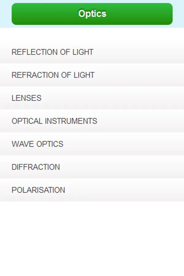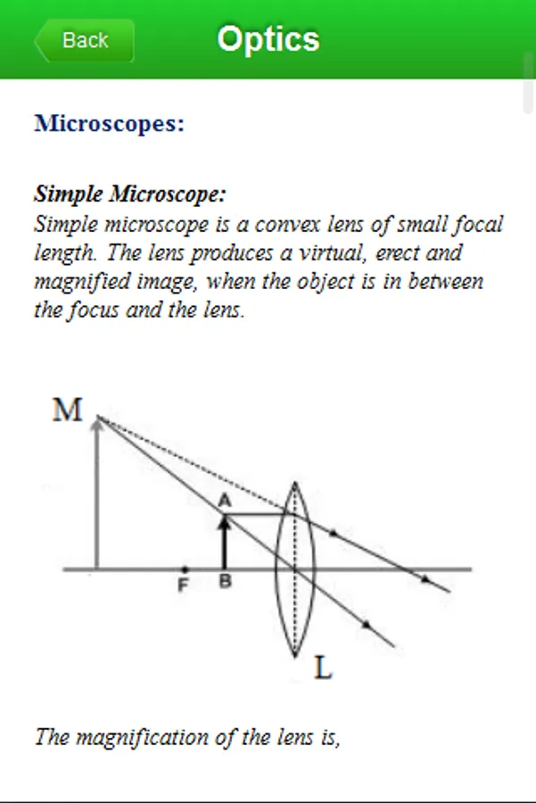 This application for optics is a pocket dictionary of all optical characteristics and its analysis with formulas to find various parameters. This helps learner’s to study Reflection, Laws of reflection, Spherical Mirrors, Formation of image by a spherical mirror, Relation between focal length and radius of curvature, Law of distances-Mirror Equation, Magnification, Linear magnification, Refraction of light, Laws of refraction, Total internal reflection, Critical angle, Applications of total internal reflection, Lenses, Optic Centre, Principal Focus, Focal length, Focal Plane, Image formation, Images formed by a convex lens, Image formed by a concave lens, Refraction at a Spherical Surface, Thin Lens Formula and Lens maker’s Formula, Law of distances, Linear Magnification, Power of a lens, Lens Combinations, Combination of two thin lenses in Contact, Combination of two thin lenses out of Contact, Scattering of light, Rayleigh scattering law, Raman scattering, Optical instruments, Microscopes, Simple Microscope, Compound Microscope, Telescopes, Refracting Telescope, Resolving Power, Wave optics, Wave motion, Wavelength and Phase of vibration, Wave front, Huygens’ Principle, Reflection of a plane wave front at a plane surface, Interference of light, Principle of superposition of waves, Condition for sustained interference, Young’s double slit experiment, Expression for bandwidth, Band width (β), Condition to produce good interference bands, Colours of thin films, Fresnel and Fraunhofer diffraction, Diffraction due to a single slit, Polarisation, Polariser and Analyser, Polaroids, and Brewster’s law. Let’s begin to learn optics.