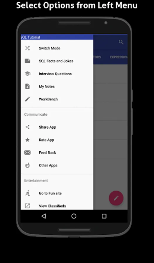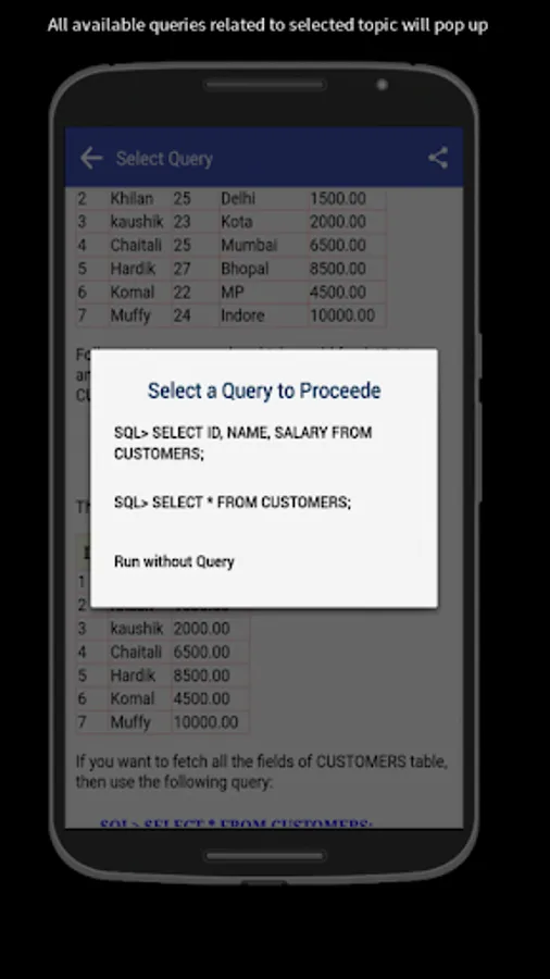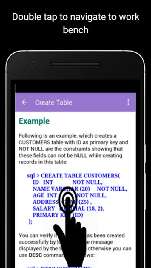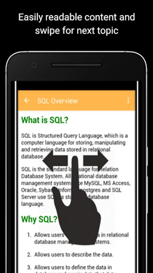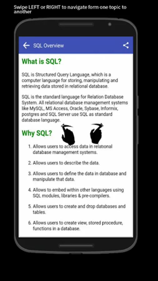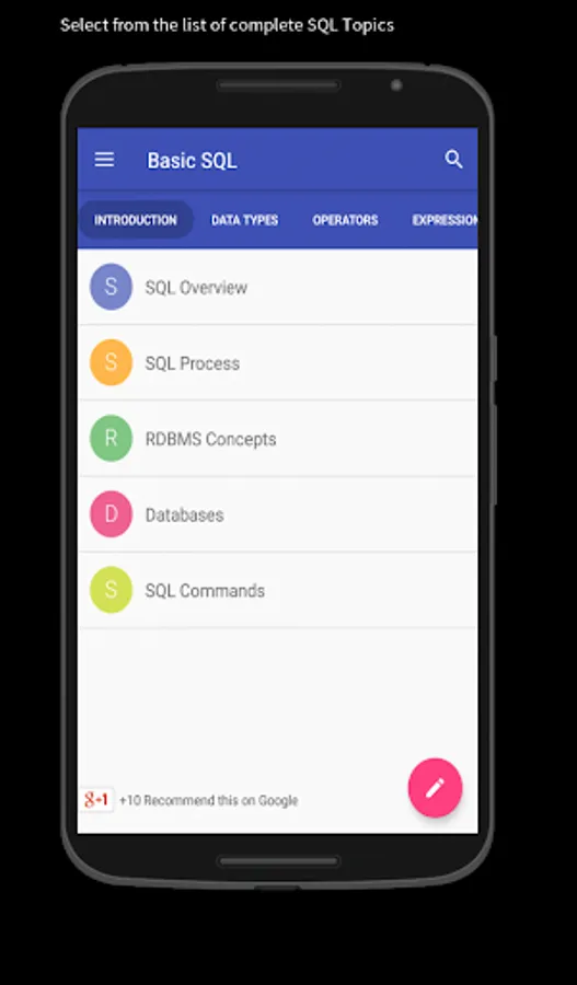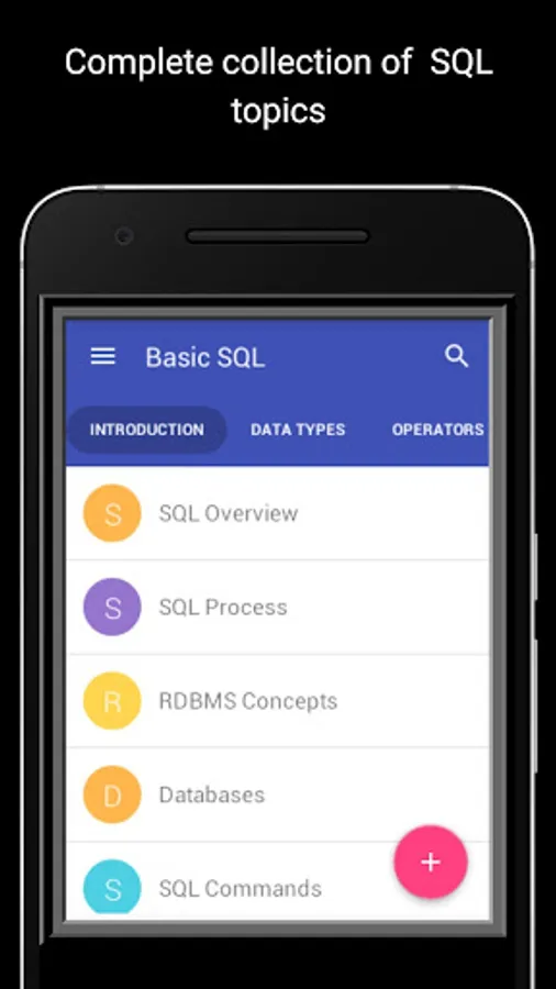 This SQL Tutorial application provides a detailed description of almost every topic of SQL.