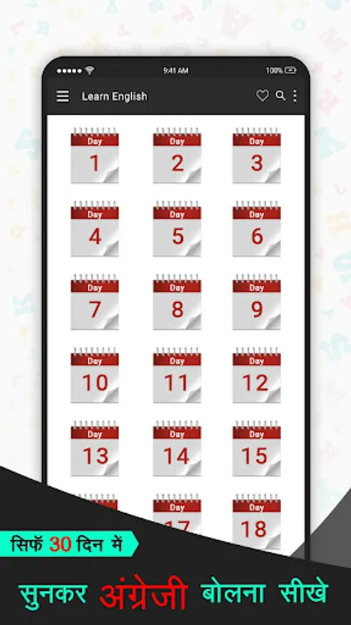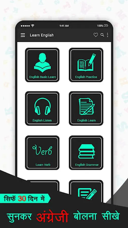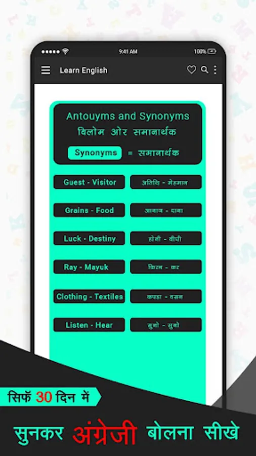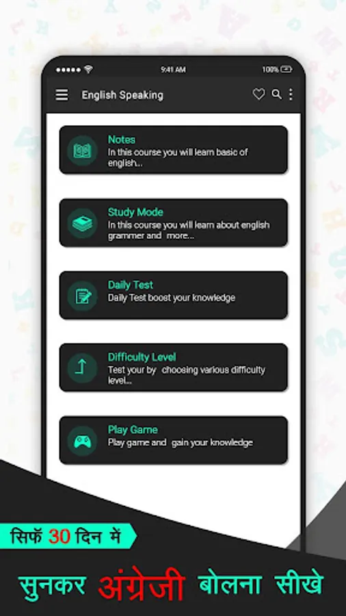 Spoken English app inside Speak english in 30 days is the easy yet very interesting hindi to English Learning app.