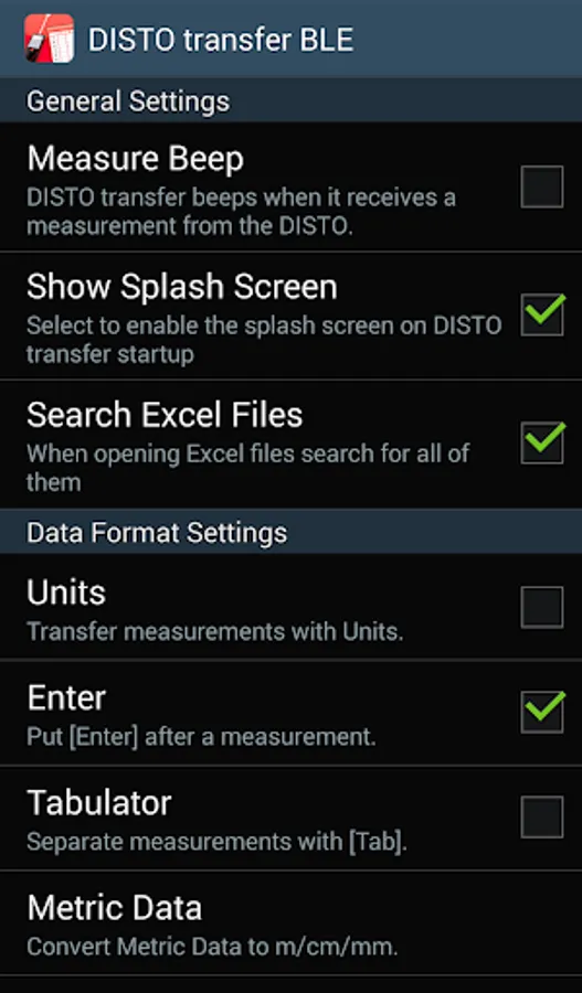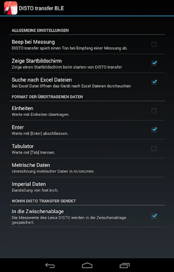 The program connects to Leica DISTO™ devices using a Bluetooth Low Energy (BT 4.0) interface (current models are Leica DISTO™ D510, Leica DISTO™ D810 touch). From your Android device, you can transfer the measurement data from the Leica DISTO™ into the Clipboard. With the D810 touch it is even possible to remotely trigger the measurement from your Android device. Once they are in the Clipboard, they can be inserted into any application.