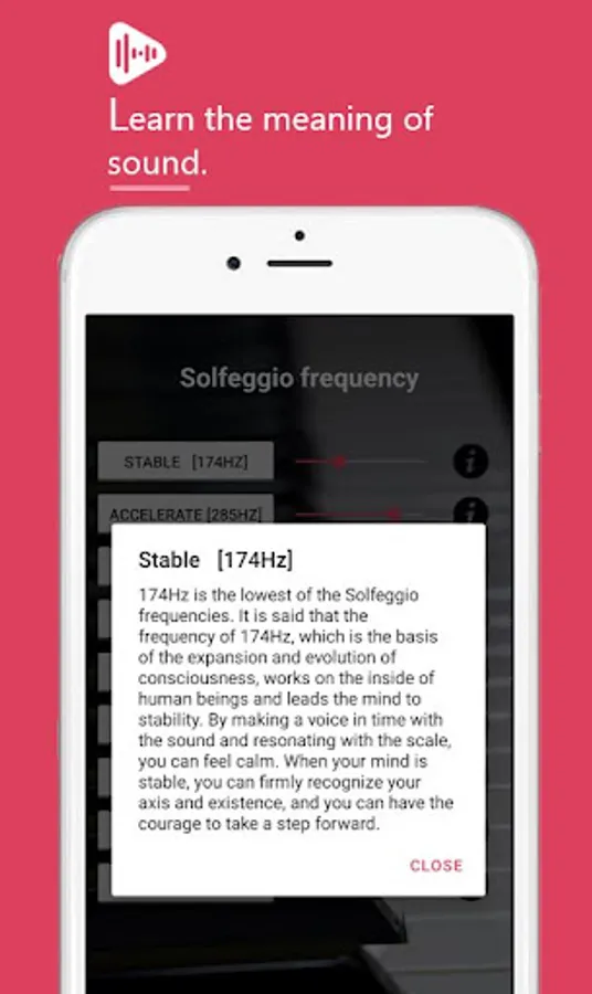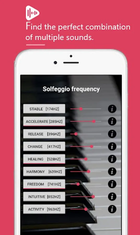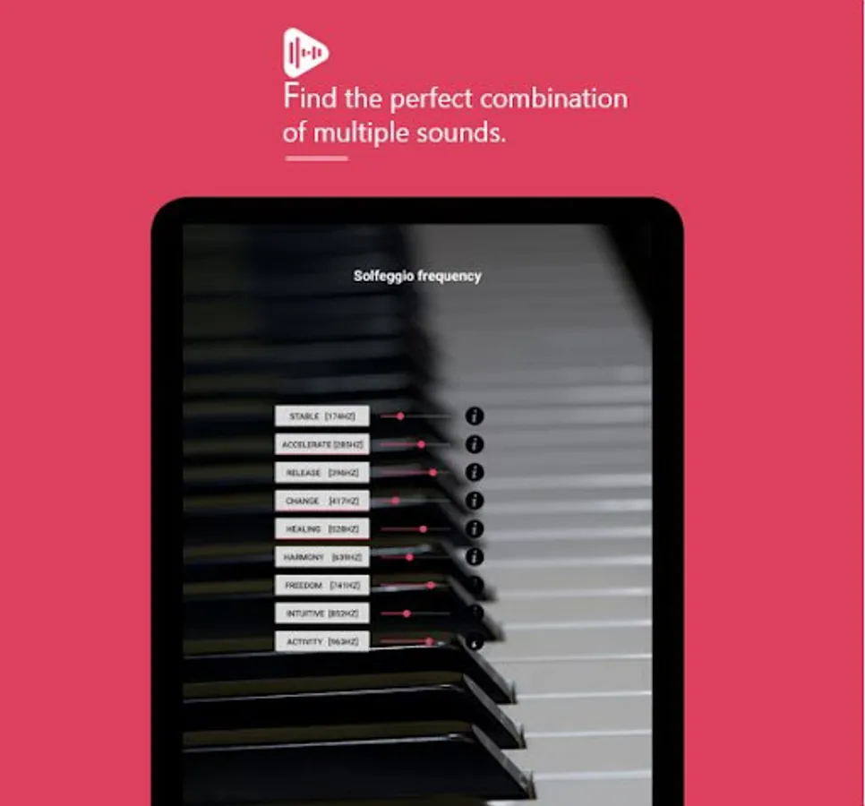 This app can play sounds of multiple Solfeggio frequencies at the same time. Find the perfect combination of sounds for you. You can increase or decrease the volume of each sound.