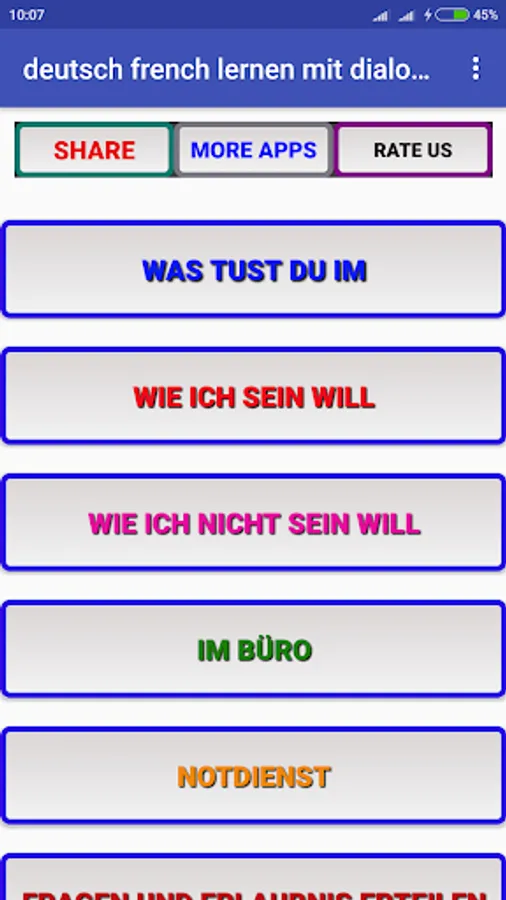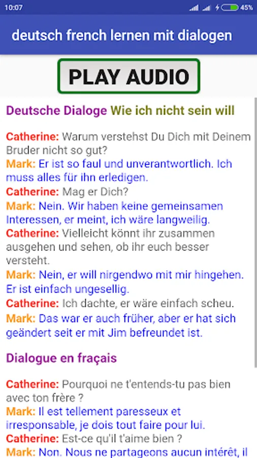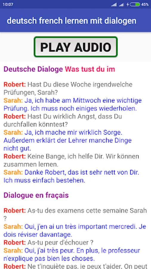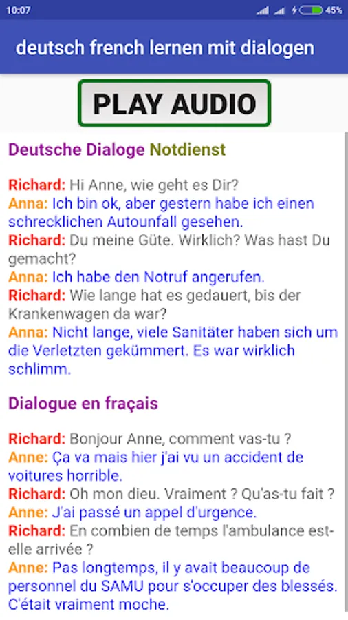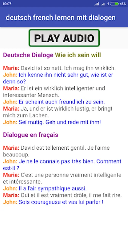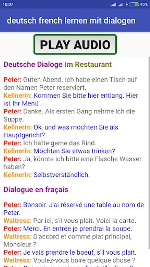 This app is designed for quick learning vocabulary and phrases in German French dialogues.