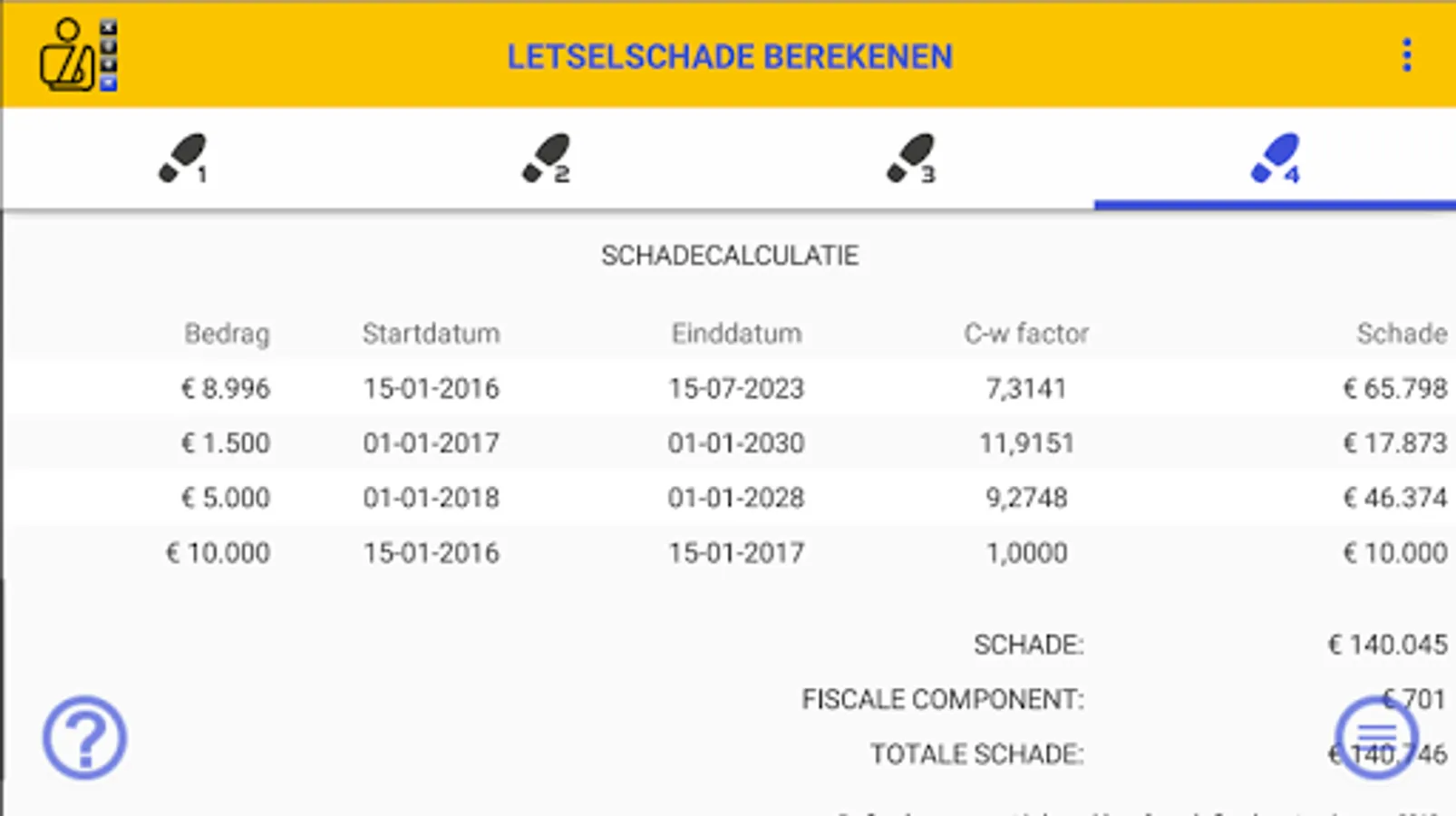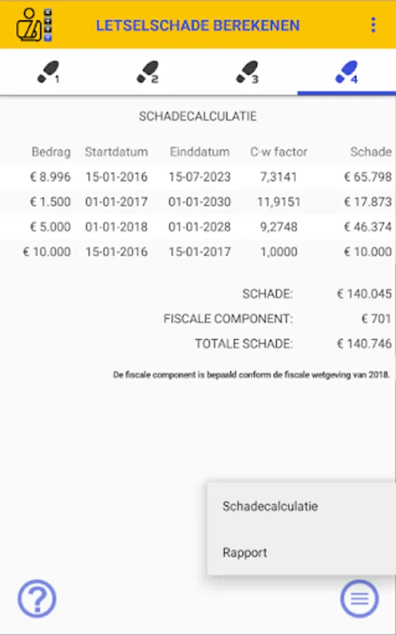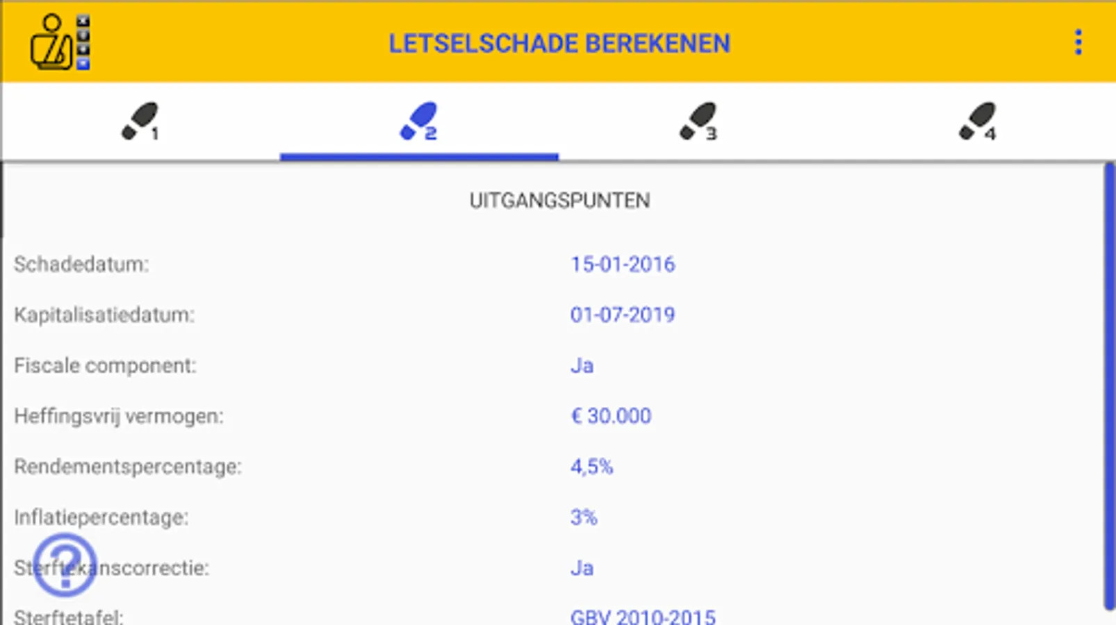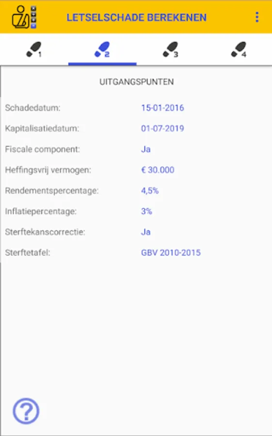 Calculation of the INJURY DAMAGE app has all the usual institutions that are socially accepted and that are applied by judges, insurers and representatives in the determination of a personal injury. You can, for example, enter a Yield rate, Inflation percentage and Mortality table. You can also opt for a calculation including or excluding a Fiscal Component.