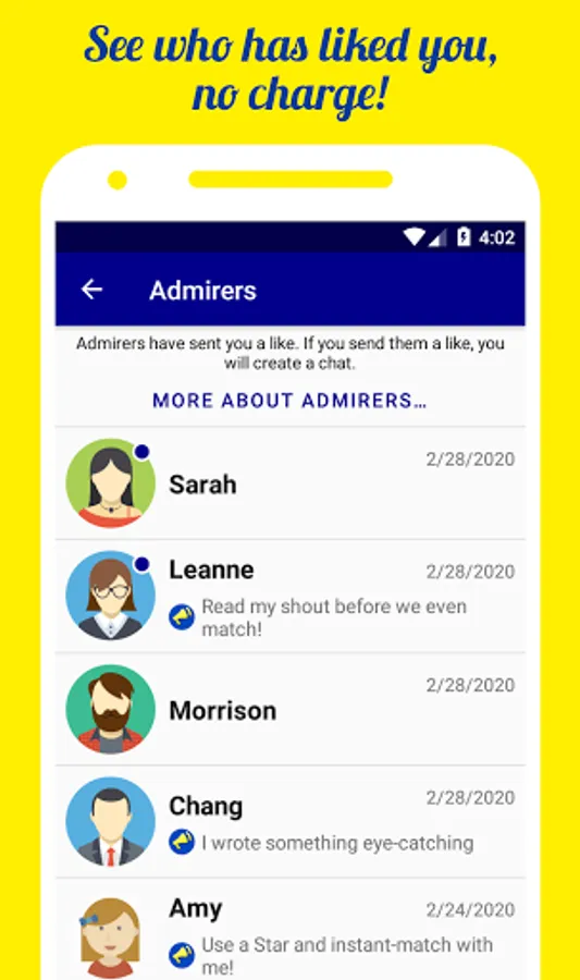 We understand that you want to know how many people are waiting for you to decide yes or no. So we not only show you how many you have, we also show who they are. See someone you like in your Admirers list but don't want to wait until they appear in your match queue? Use Instant Match to connect with them right away.