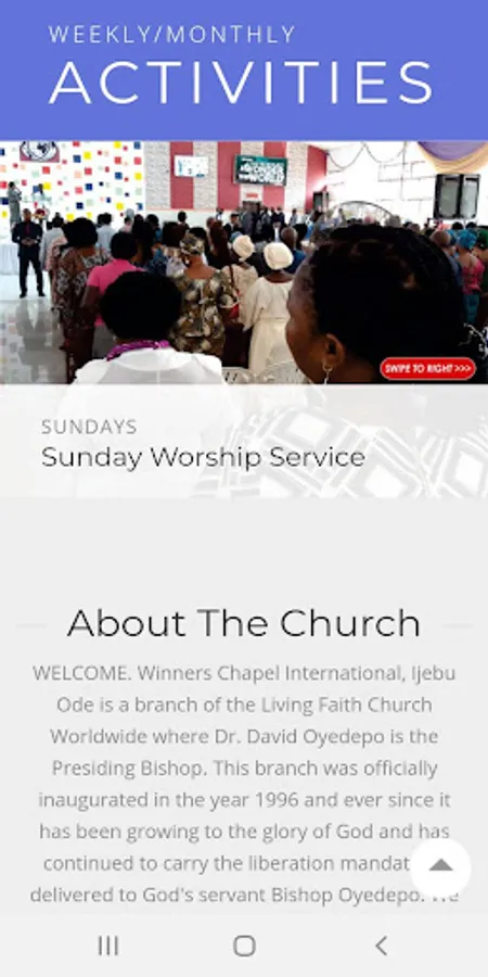 Winners Chapel International, Ijebu Ode is a branch of the Living Faith Church Worldwide where Dr. David Oyedepo is the Presiding Bishop. This branch was officially inaugurated in the year 1996 and ever since it has been growing to the glory of God and has continued to carry the liberation mandate as delivered to God's servant Bishop Oyedepo. We are a Word based church where we teach God's people how to activate their faith for exploits in life. The birth of this church was divinely orchestrated through various encounters experienced by the Presiding Bishop, Dr. David Oyedepo. These encounters are in two fold. One is a church spread mandate and the second is a Foreign Mission Mandate. If you are seeking God's presence and power, we invite you to join us as we worship together. Here, you will find friendly people, liberating messages, and great programs for everyone in the family!.