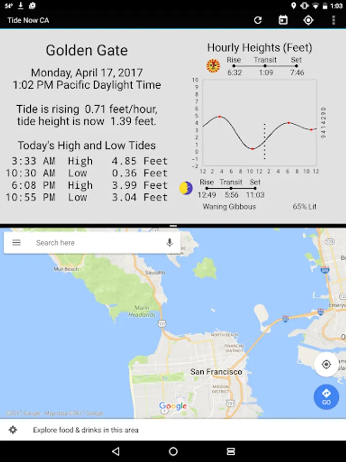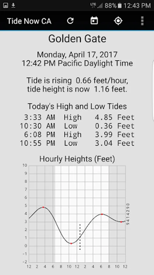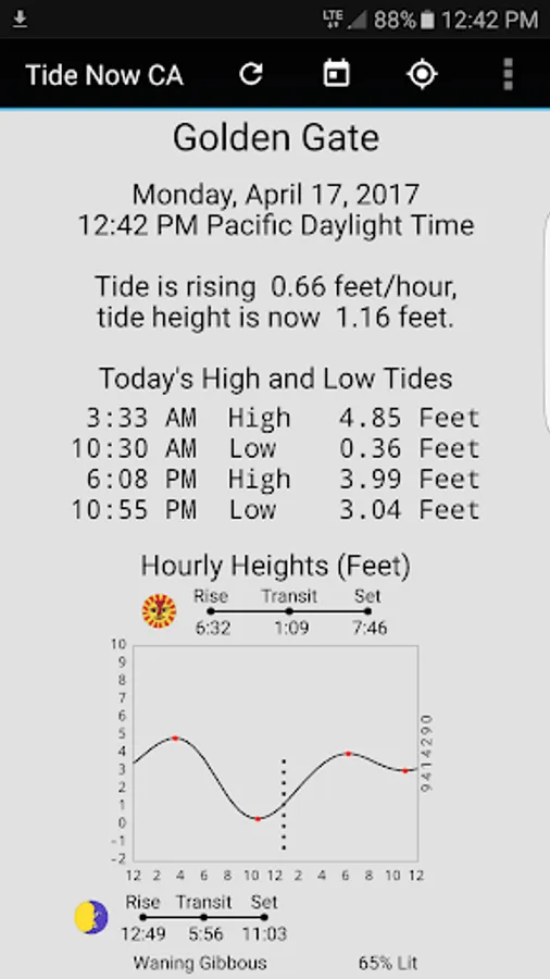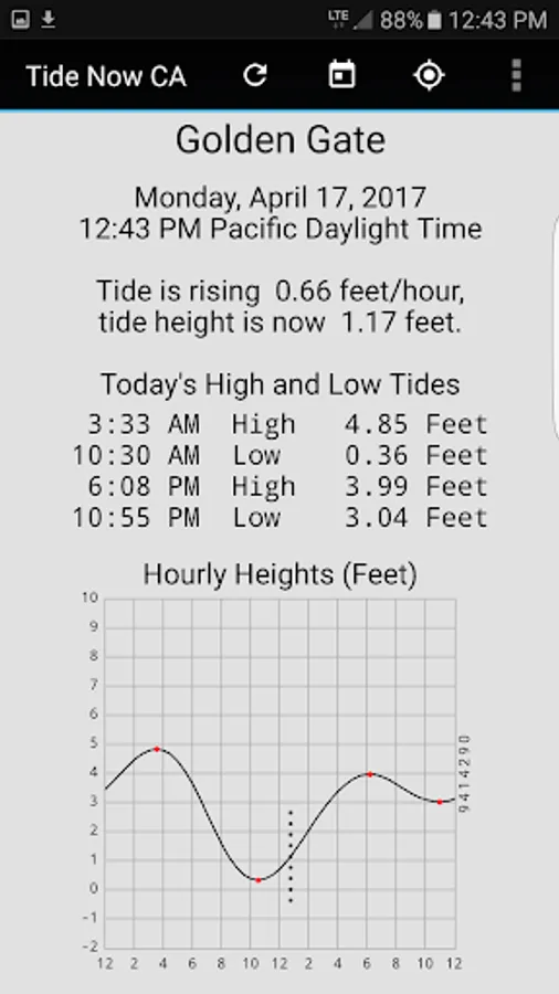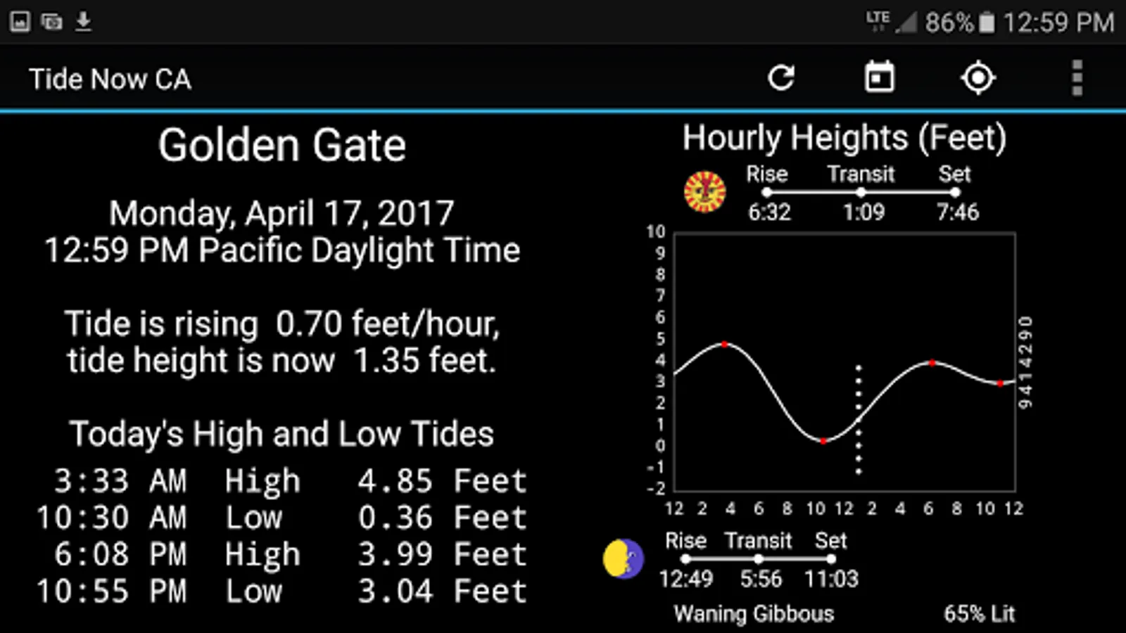 Tide Now CA is a tide calculator for the state of California. It displays a tide graph, daily tide table, present tide status, and daylight/sun/moon timing. It supports 146 locations in organized into 14 regions. There is a chart button that shows the currently loaded station location.
