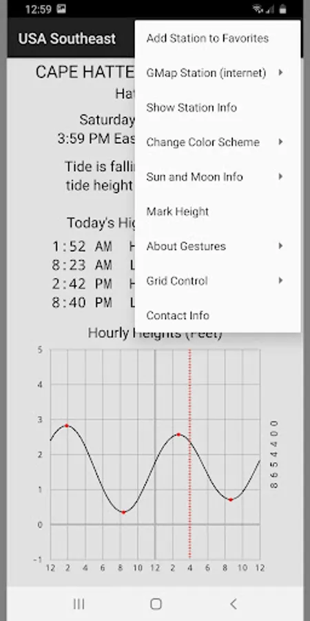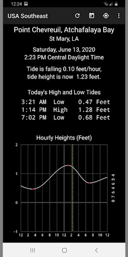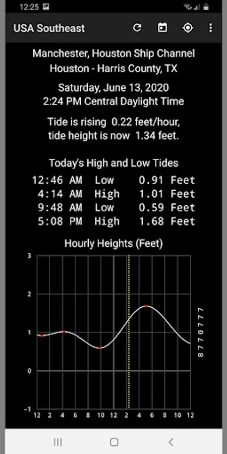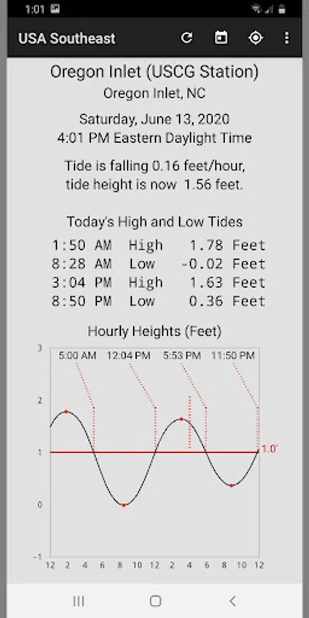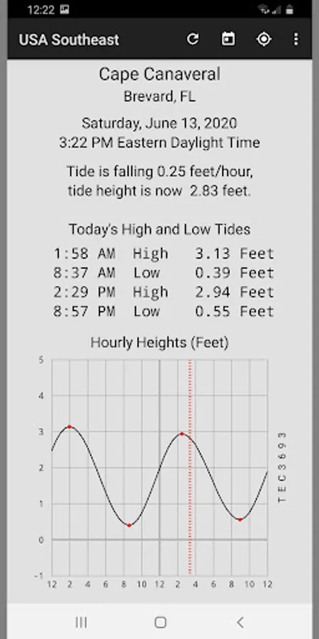 The tidal status presentation gives an immediate snapshot of the tide situation, more useful than just a standard list of highs and lows. The display can be refreshed at any time to update this status. This app is designed for use while actively out and about along the waterfront. It uses large text and the bright color scheme is easily read in the bright sun.