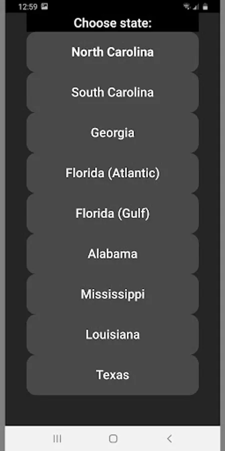 Tide Station Selection. At any time a given state is available for navigation through the location button. You choose a region, then a station. You select another state by swiping upwards and choosing one. Saved shortcuts allow direct jumps to any station in any state covered by the app.