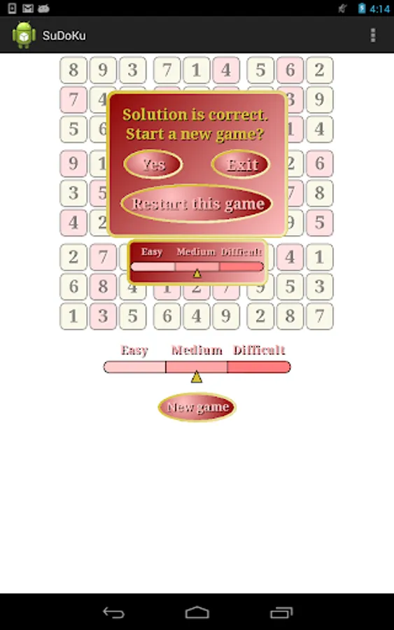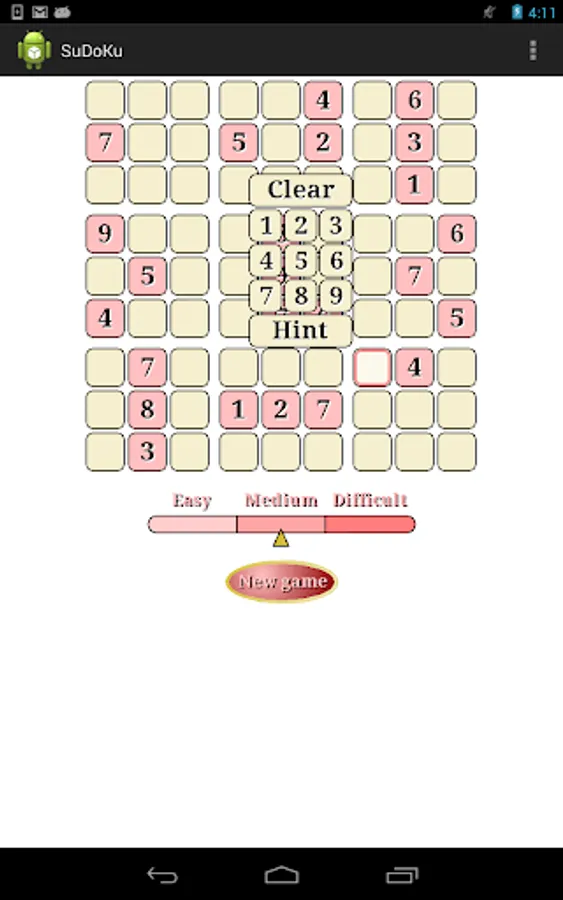 Find hidden digits that compose the 9 by 9 matrix so that each row, each column and each 3 by 3 square contains all digits from 1 to 9 (no repetitions). To play, touch the cell that you want to modify and pick a digit from the popped up window.