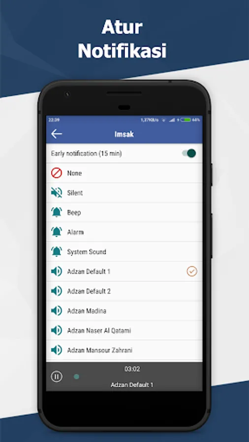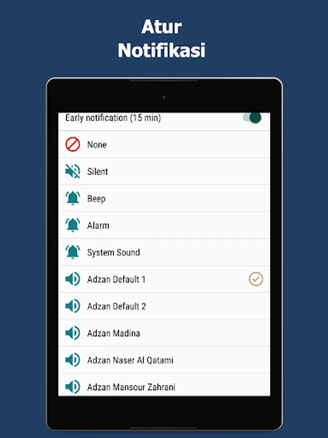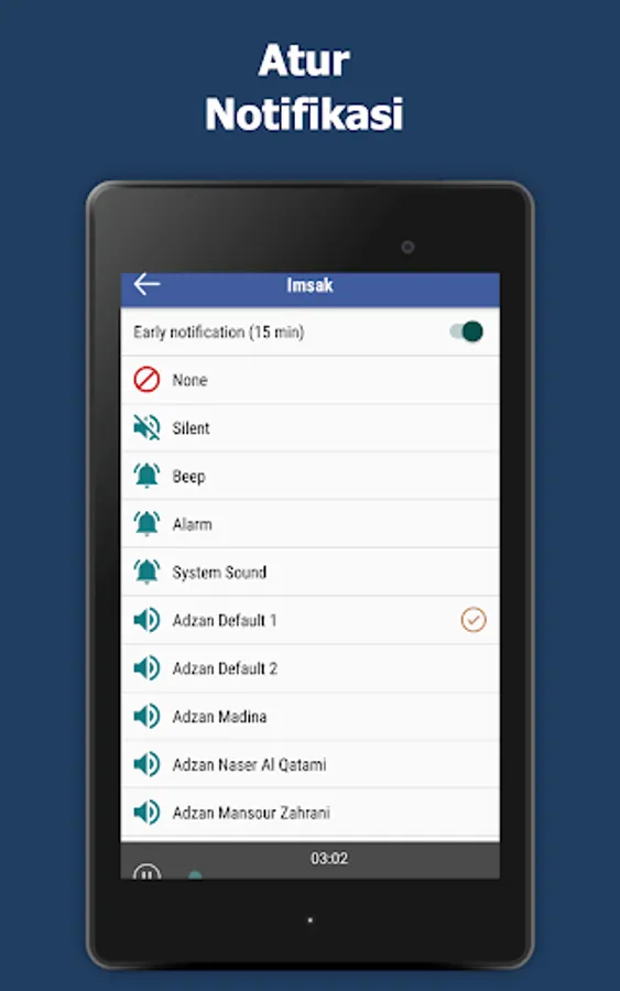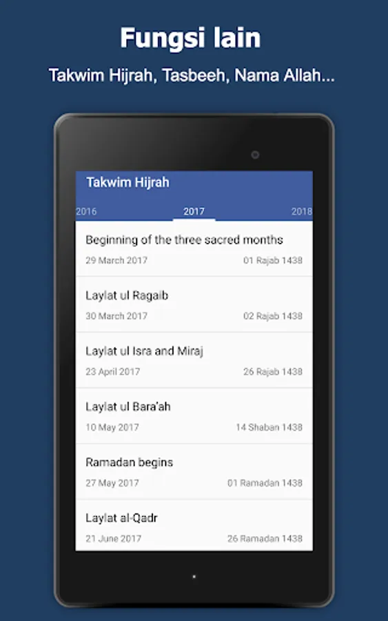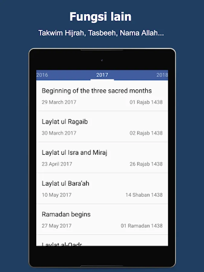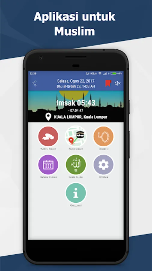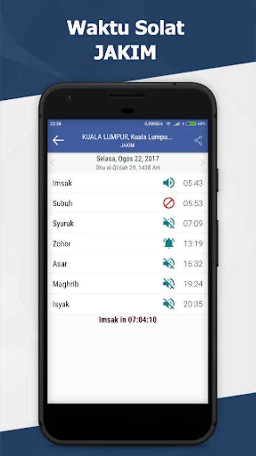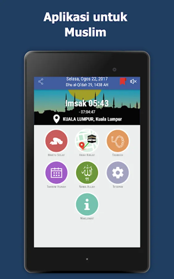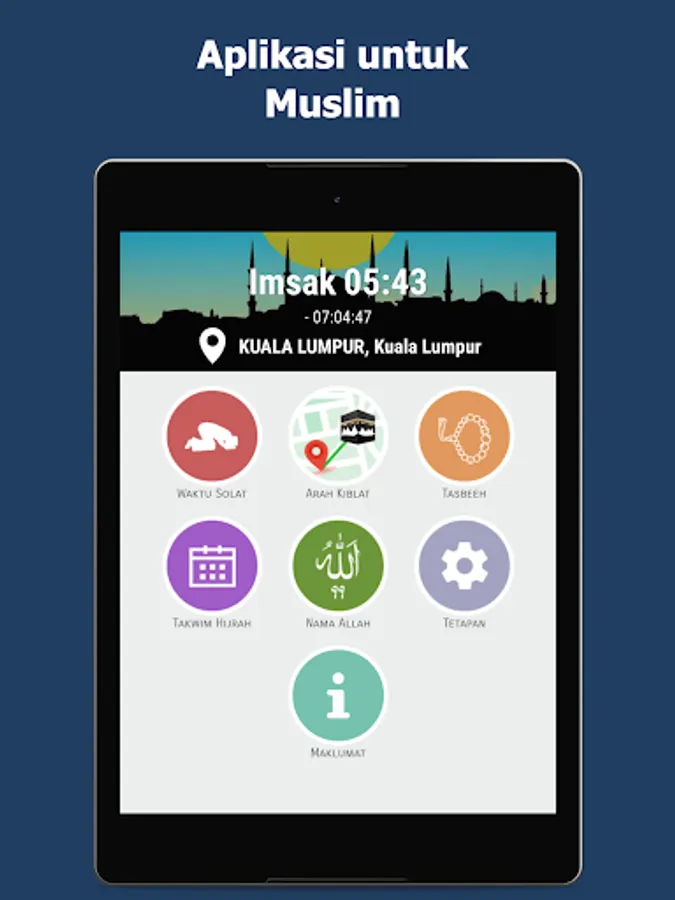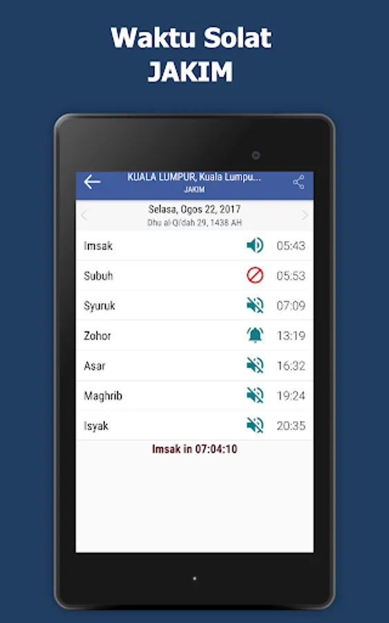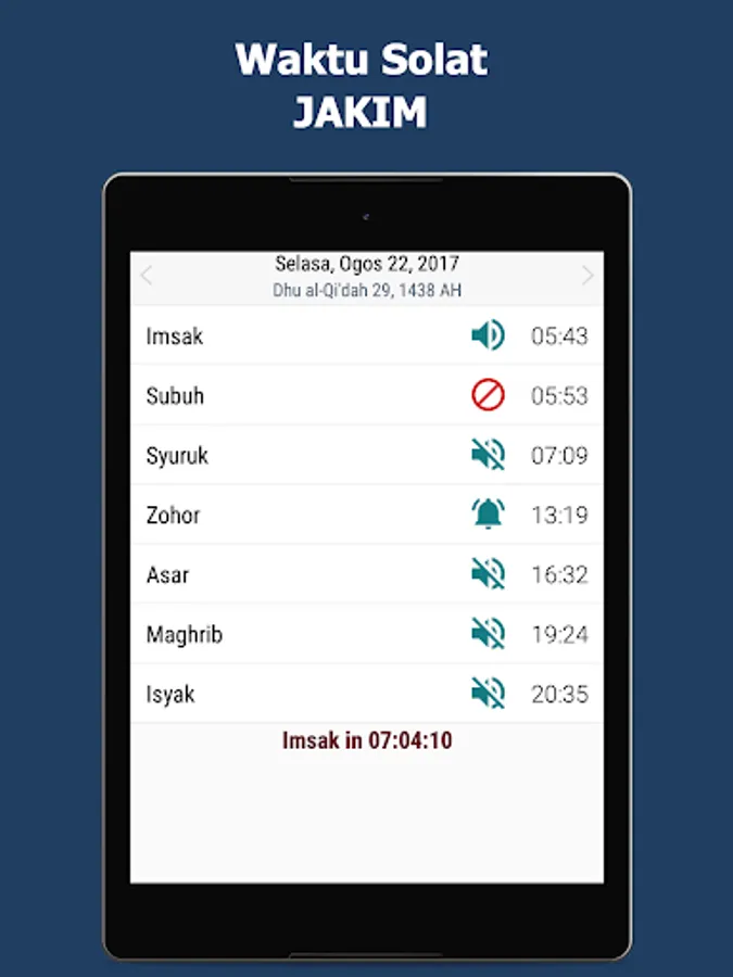 Prayer times and call to prayer: Imsak, Subuh, Syuruk, Zohor, Asar, Maghrib and Isyak.
