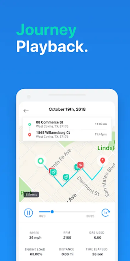 • Driver score and coaching tips – Hard acceleration and braking events highlighted, plus a score for every trip, along with pro tips for a smoother, safer more economical ride.