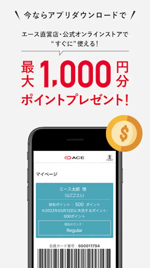You will receive 500 yen worth of points that can be used immediately at ace directly managed stores and online stores.