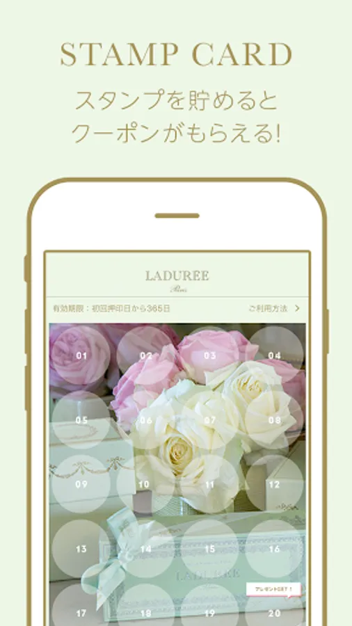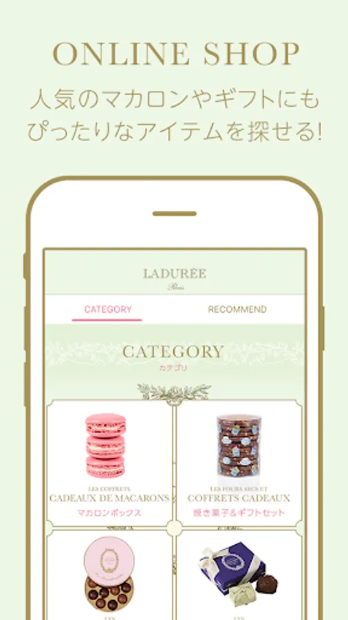 The copyright of the contents described in this application belongs to LADUREE JAPON Co., Ltd., and any action such as duplication, quotation, transfer, distribution, reorganization, modification, addition, etc. without permission for any purpose is prohibited.