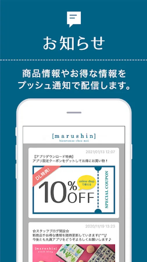 With this app, you can not only purchase all the products handled by marushin, but also receive campaign information and special deals.