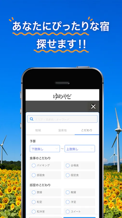 You can easily search for your favorite hotel or ryokan by narrowing down your search by details such as meals, rooms, and area.
