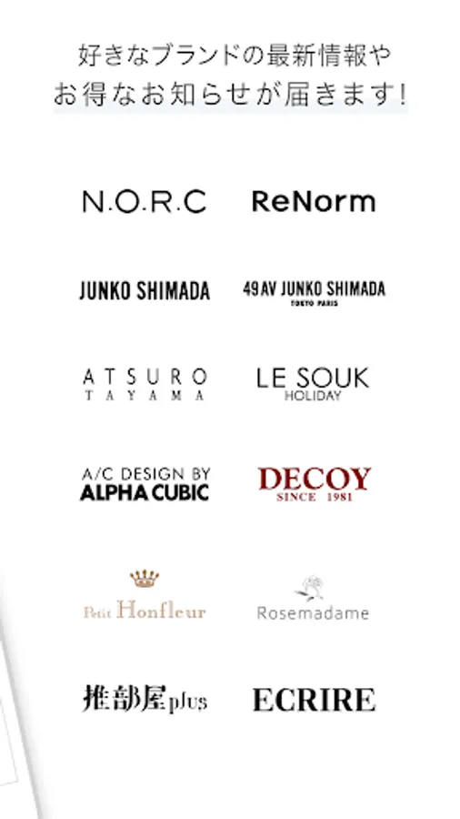 N.O.R.C, ReNorm, JUNKO SHIMADA, ATSURO TAYAMA, LE SOUK HOLIDAY, A / C DESIGN BY ALPHA CUBIC, DECOY, Pet Introducing the official Cross Plus app, which is a collection of popular brands such as Honfleur, ECRIRE, Rosemadame, and Oheya Plus!