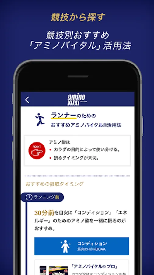 From “Search by Series”, “Search by Body Purpose” and “Search by Competition”, you can search for “Amino Vital” that is perfect for you.