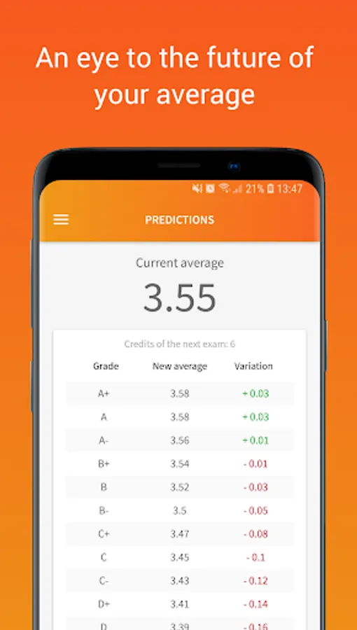 Its main feature is to work as a digital transcript, where you can enter your exam information and in a moment see your average and the total number of earned credits. You’ll also be able to see charts that describe different trends of your university career, and you can have a look to the future to see how your average can change according to the result of your next exam.