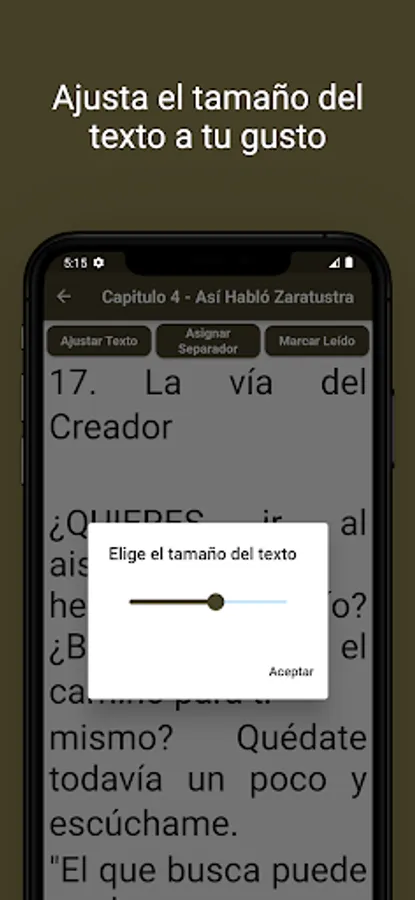 Discover "Thus Spoke Zarathustra" like never before. Our app transforms this monumental work into an interactive reading experience. We provide you with all the tools to navigate the world of Zarathustra. Mark chapters, assign separators and customize the size of the text. You are in full control of your philosophical odyssey.