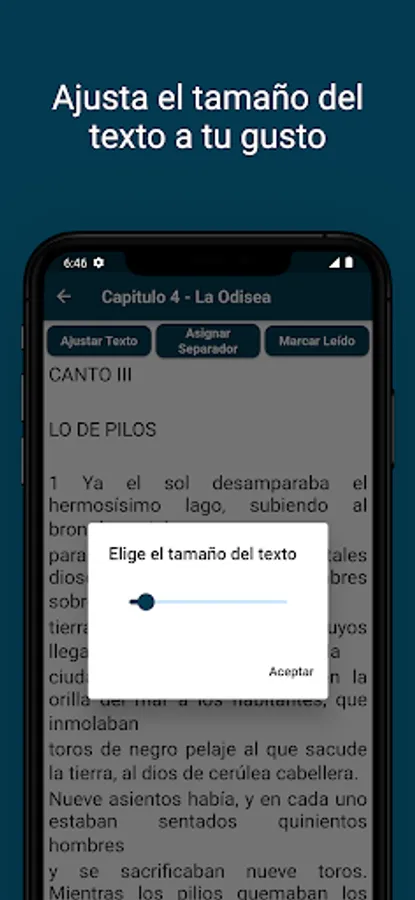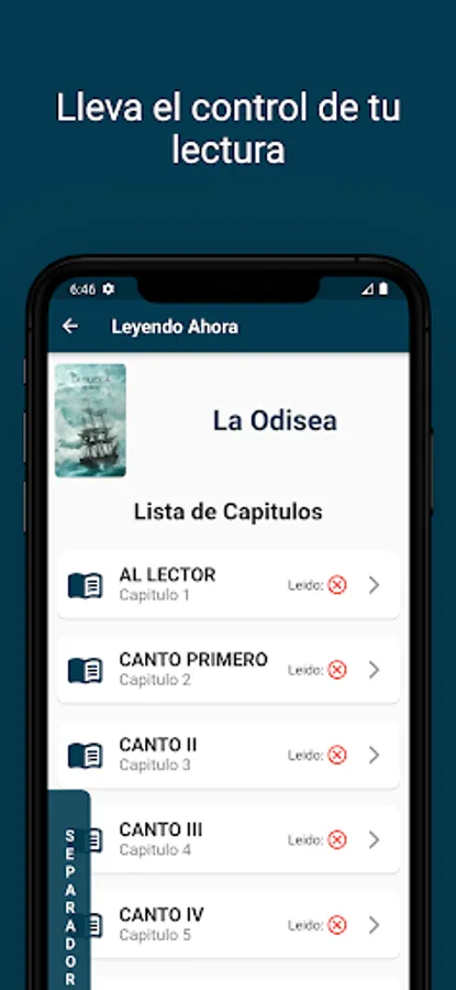 Did you leave your adventure in the middle to return later? No problem, our app allows you to assign a bookmark or separator to the chapter you're reading. Return to your exact point in an instant and continue your journey with Odysseus without problems.