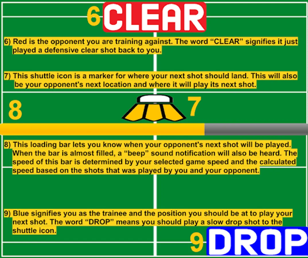 You can finally train alone effectively without a coach or partner. You can use Shuttlefly by simply finding an open area or a real badminton court and place the phone in a middle front area facing you. The blue icon represents you and where you are supposed to be. The red icon is your AI opponent. The training screen draws out a real badminton court. You use footwork to run to the area relative to the blue icon from the screen. The blue icon also specifies what kind of shot you should play and the shuttle icon indicates the location you should play to. The red icon is your imaginary opponent and you train by responding to the shots that it plays. This is an advance version of the six point shadow footwork drill people are used to doing. You can't predict the next shot so it simulates real game situations. This will help you improve your speed, stamina, and reaction time!