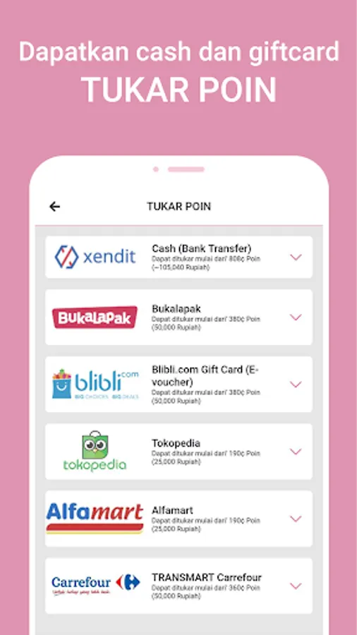 You can redeem points (¢) that you can exchange with gift cards from Blibli.com and Tokpedia! (1 ¢ = Rp. 130, -.)