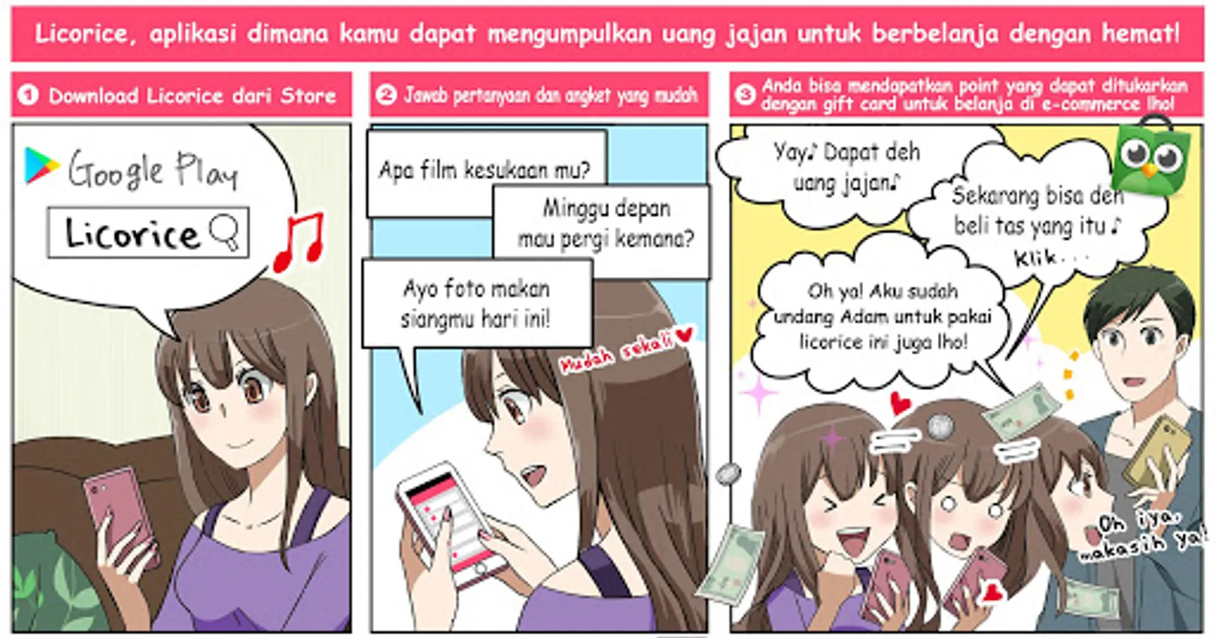 You can fill in the survey at lunch time or other rest hours. Fun isn't it? Licore is a simple survey application where only you fill out the easy surveys that we send, you will get points that can be exchanged for shopping vouchers! Points that have been collected can be exchanged for top gift marketplace cards in Indonesia such as Tokopedia and Blibli.com!
