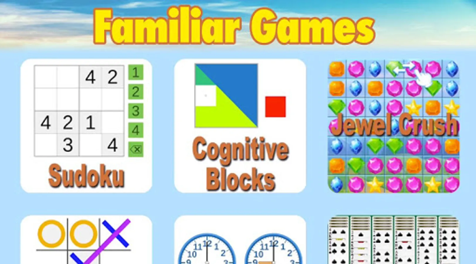 • 40+ cognitive games designed for people with low computer skills: Sudoku, Tic-Tac-Toe, Clocks, and other brain games, from very easy to challenging