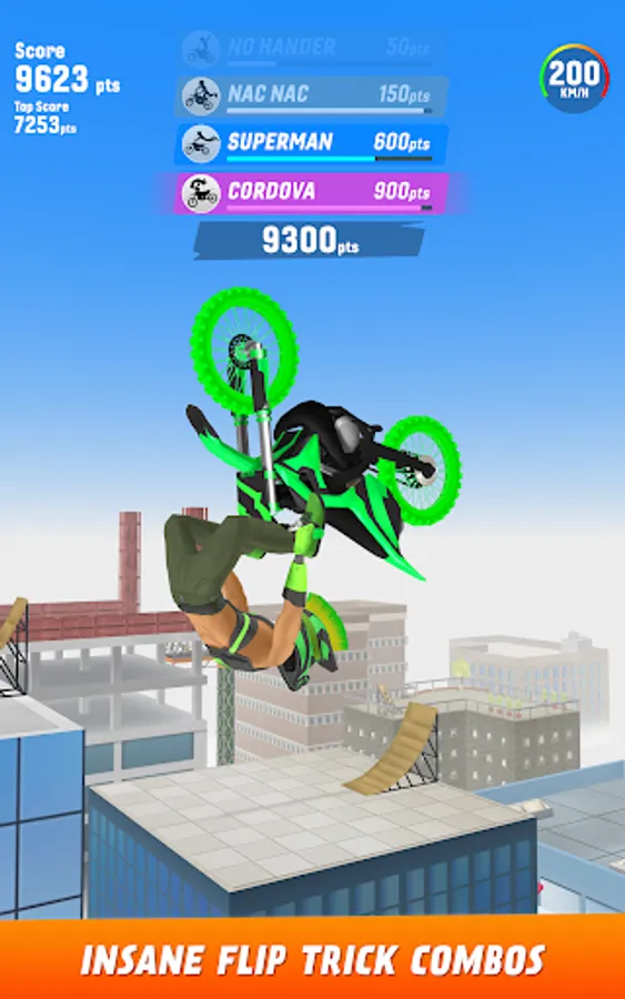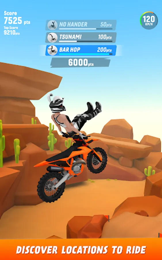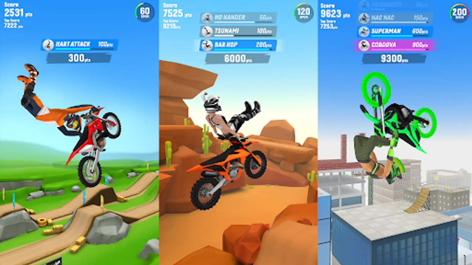 Tsunami, Seat-Grab, Bar-Hop, Cordova and the list of tricks goes on. Combine mad tricks and get crazy scores. Pump your adrenaline with high speeds and extreme motorbike jumps. Be a tricks master.