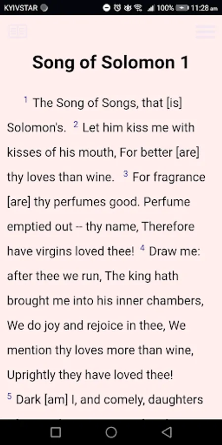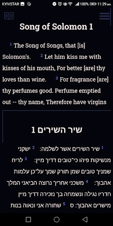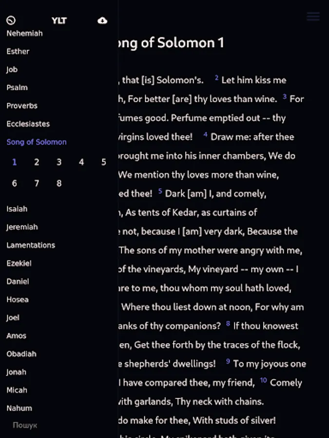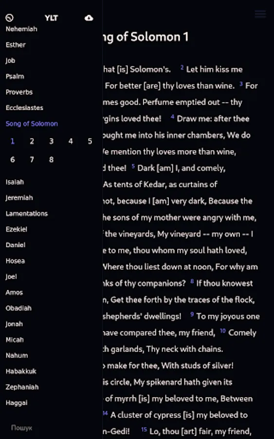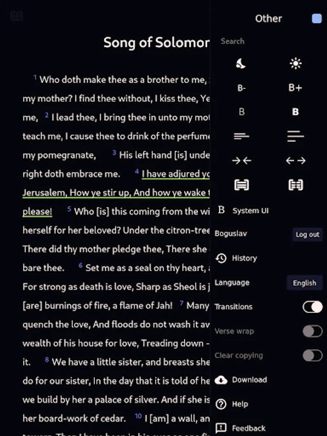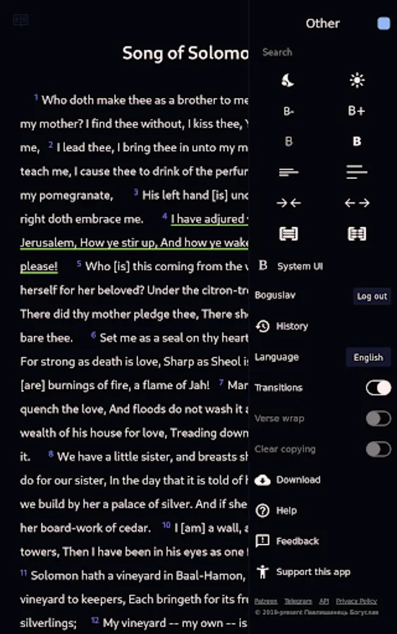 This app is built for reading the Bible on full screen. There is available such features as Bible texts of 56 translations, search, something like bookmarks, reading history, night/light theme, regulation of font size, font-family and some other small nice features. Localization for Українська, Русский, German, Portuguese and Español.