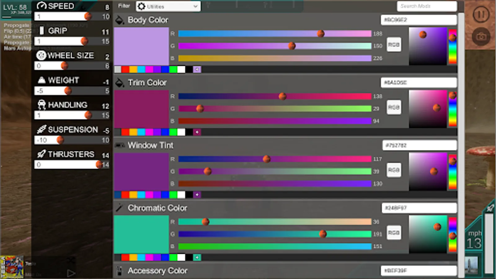 - Unlockable upgrades including color, physics, effects and accessories (Mods).