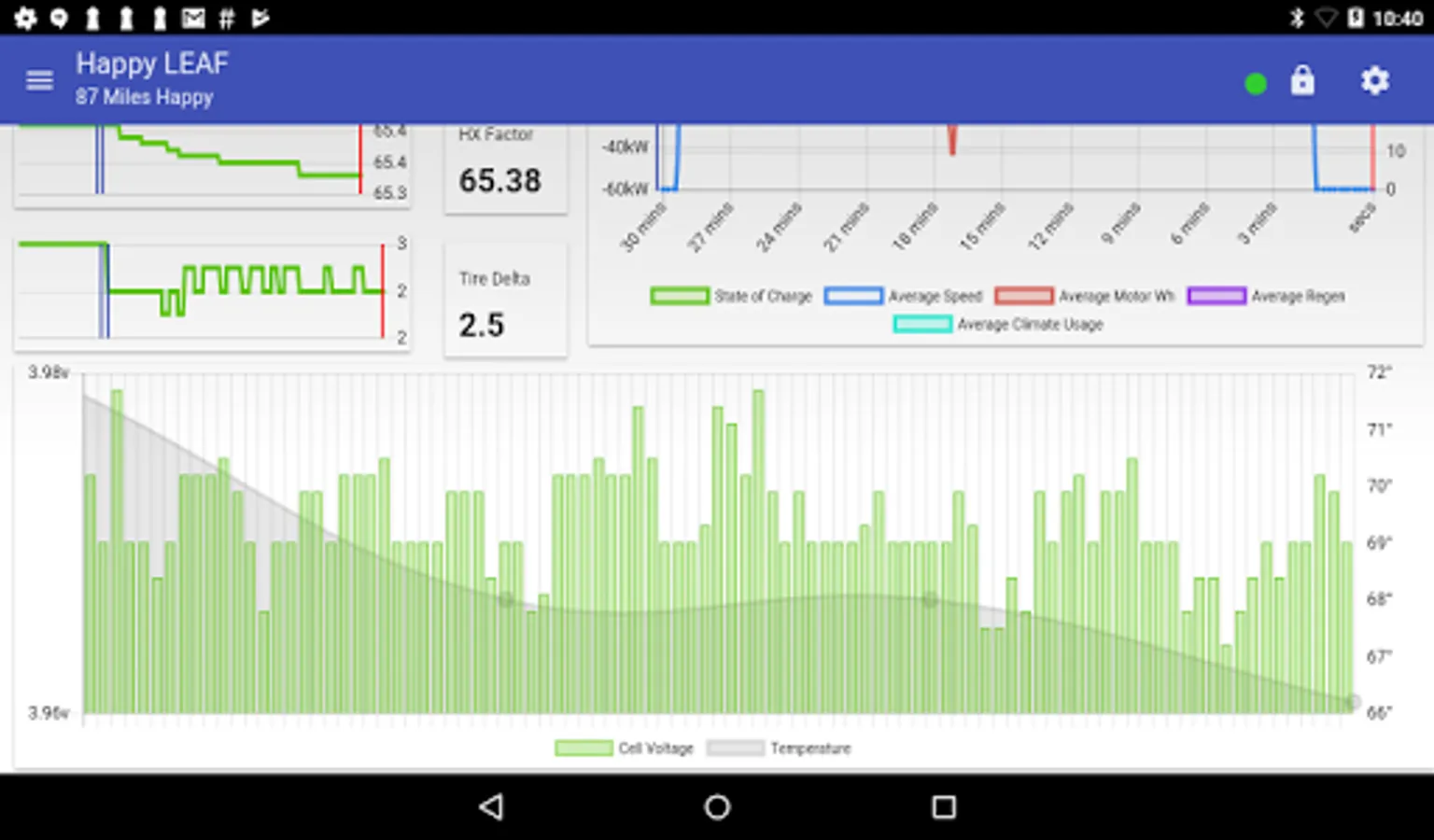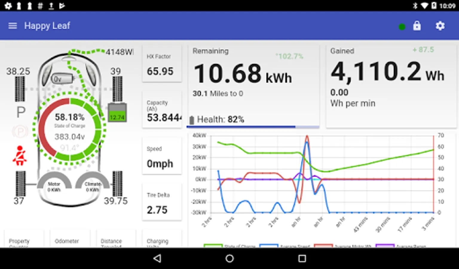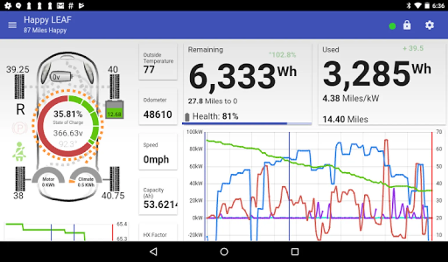 Happy LEAF aims to be the missing interface from the original Nissan LEAF. With Happy LEAF you can ease range anxiety by knowing how much energy is remaining in your battery, and see useful statistics from the car.