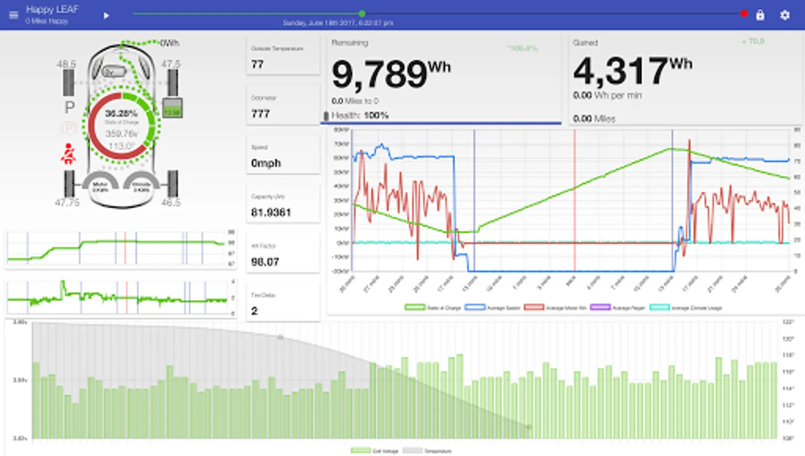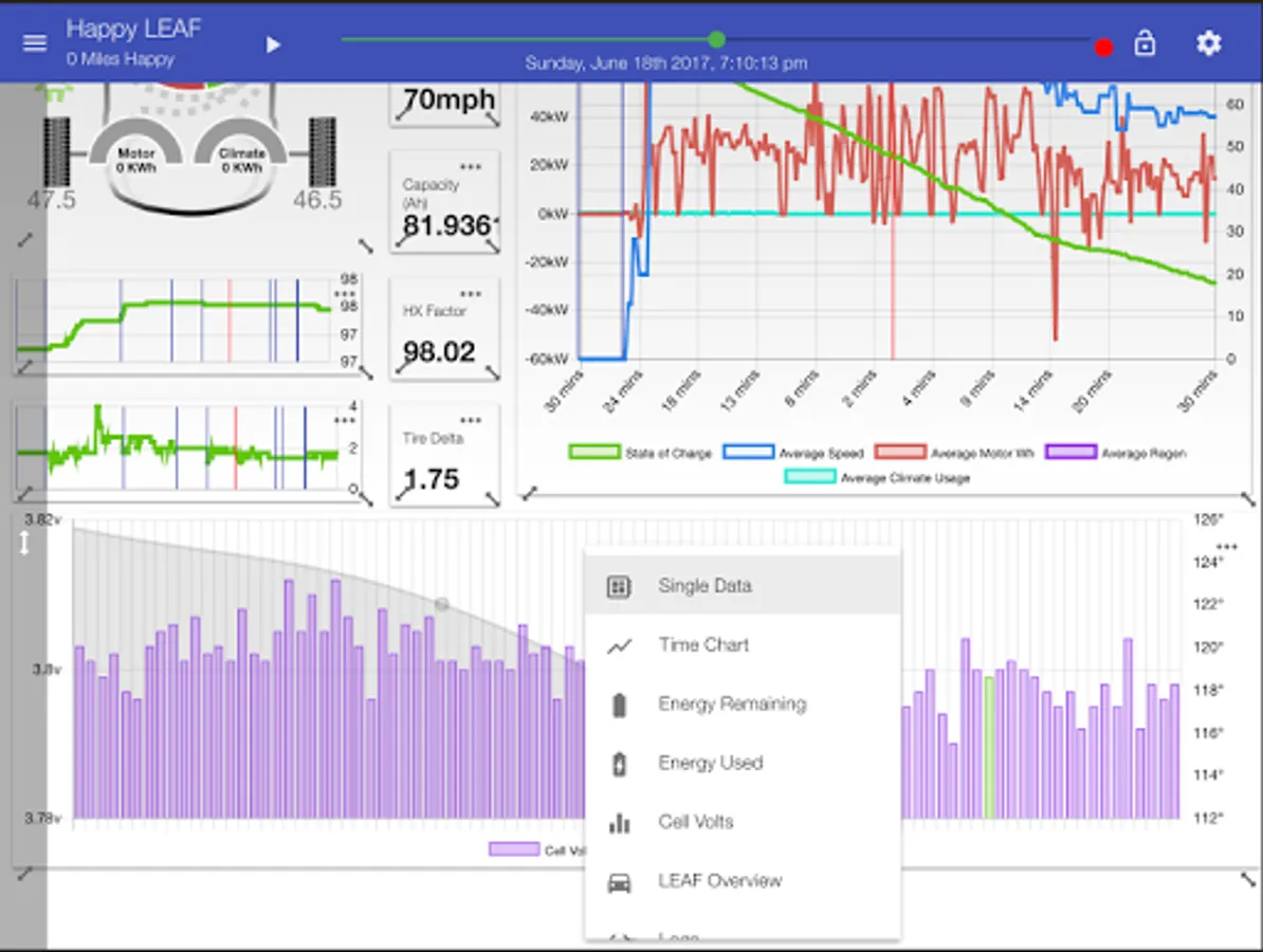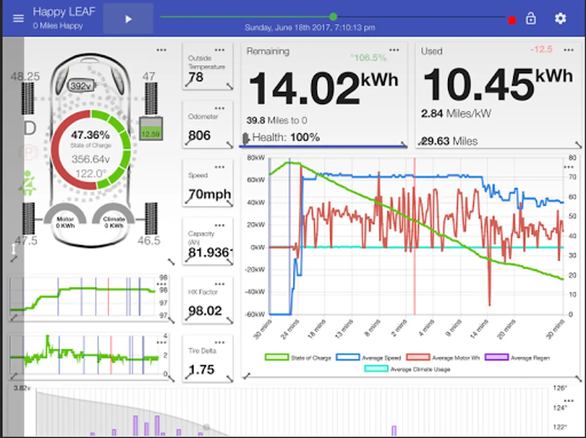 Happy LEAF allows you to modify the grid layout, and fully customize the Happy Leaf dashboard using widgets. Happy Leaf also allows viewing previous trips and play them back like a movie.