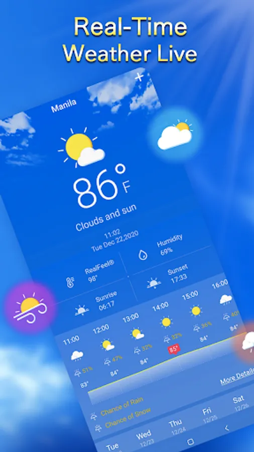 Provide daily temperature, weather phase, humidity, UV index, rain snow icing probability, lightning probability, wind direction/speed/gust, sunrise sunset time. Plan food, clothing, housing and transportation in advance . Forecast long-term weather, happy plan, happy play.