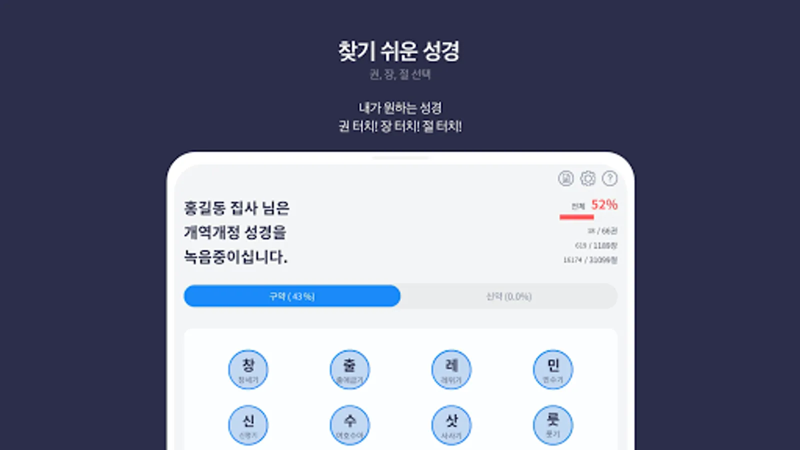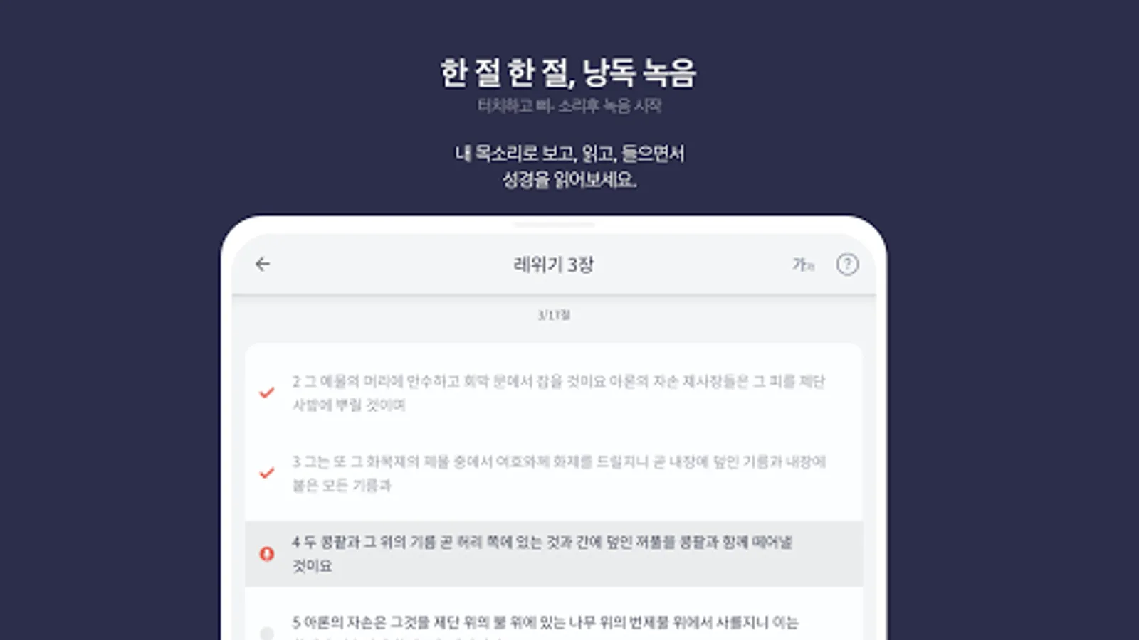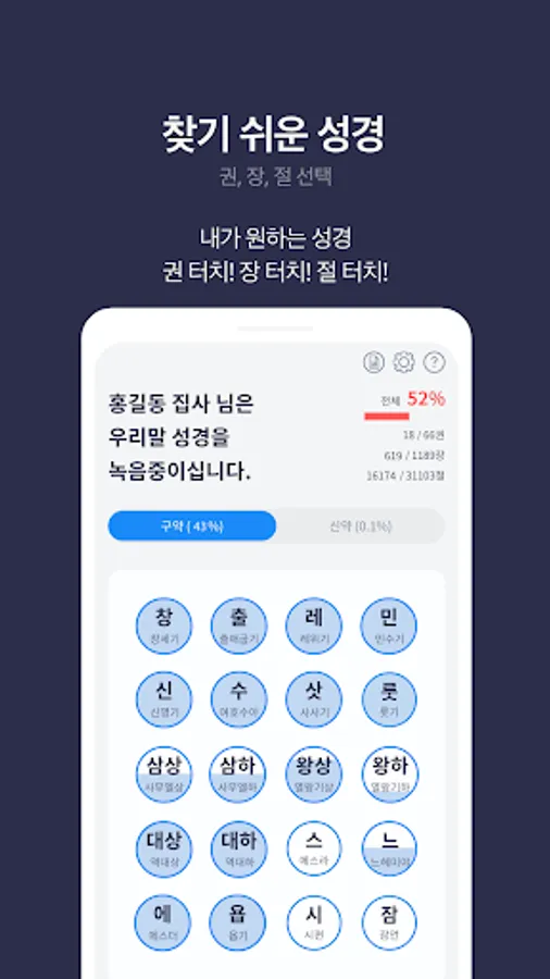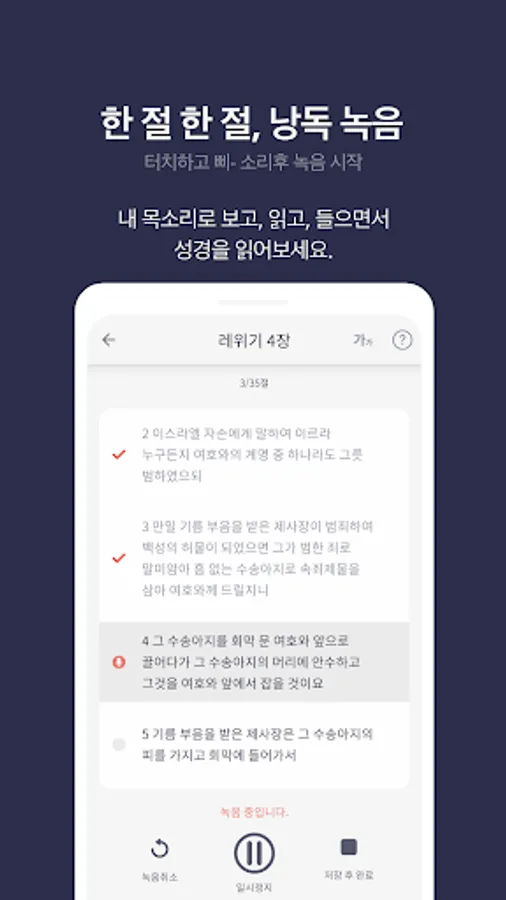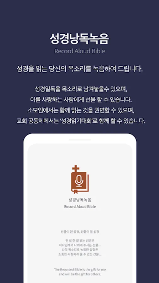 - If you record in verse units, it will be combined into chapter units (chapters 1, 2, 3…) or volume units (Genesis, Exodus, Gospel of John…) to make one reading file. Enjoy the joy of gifting the provided file to your acquaintances.