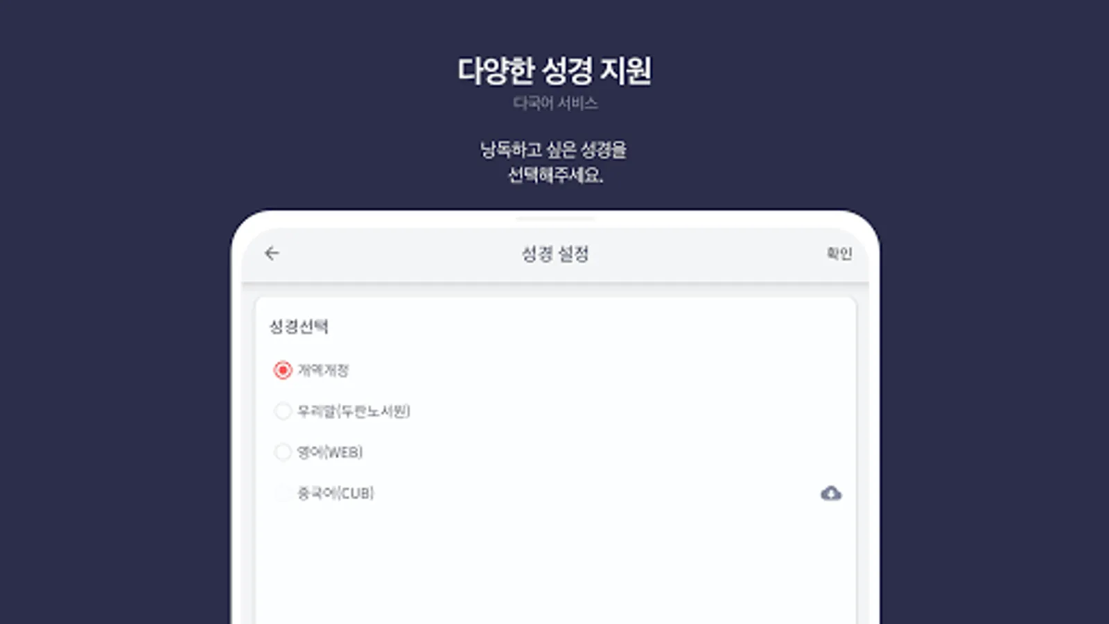 The 『Bible Revised Version』 supported by this app has been licensed by the Korean Bible Society, and the 『Korean Bible』 has been licensed by the 'Durannoseowon' in accordance with legal procedures, respectively.